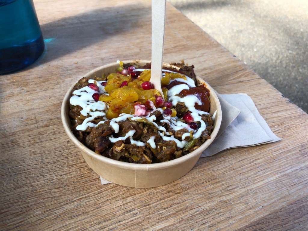 - The group stopped at Spitalfields Market after our visit to the Museum of London, and after I completed my shopping, I looked around for food and found this stand selling a small number of Indian dishes. I forgot the name of the specific food, but I recall that its base was lamb mixed in with various spices and vegetables, and that the vendors put chili sauce and pickled pineapple on the top. Whatever amount I paid for it was well spent, because it was absolutely delicious! The sweetness of the pineapple on top complemented the savory meat perfectly, and I would not hesitate to recreate it if I knew the ingredients!