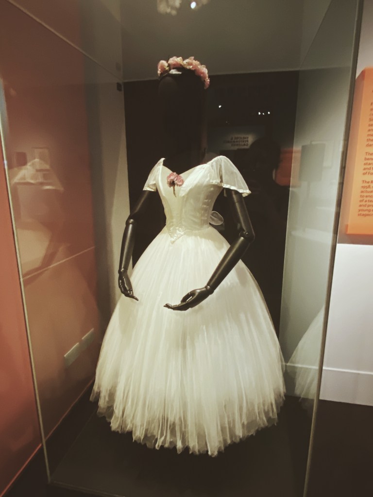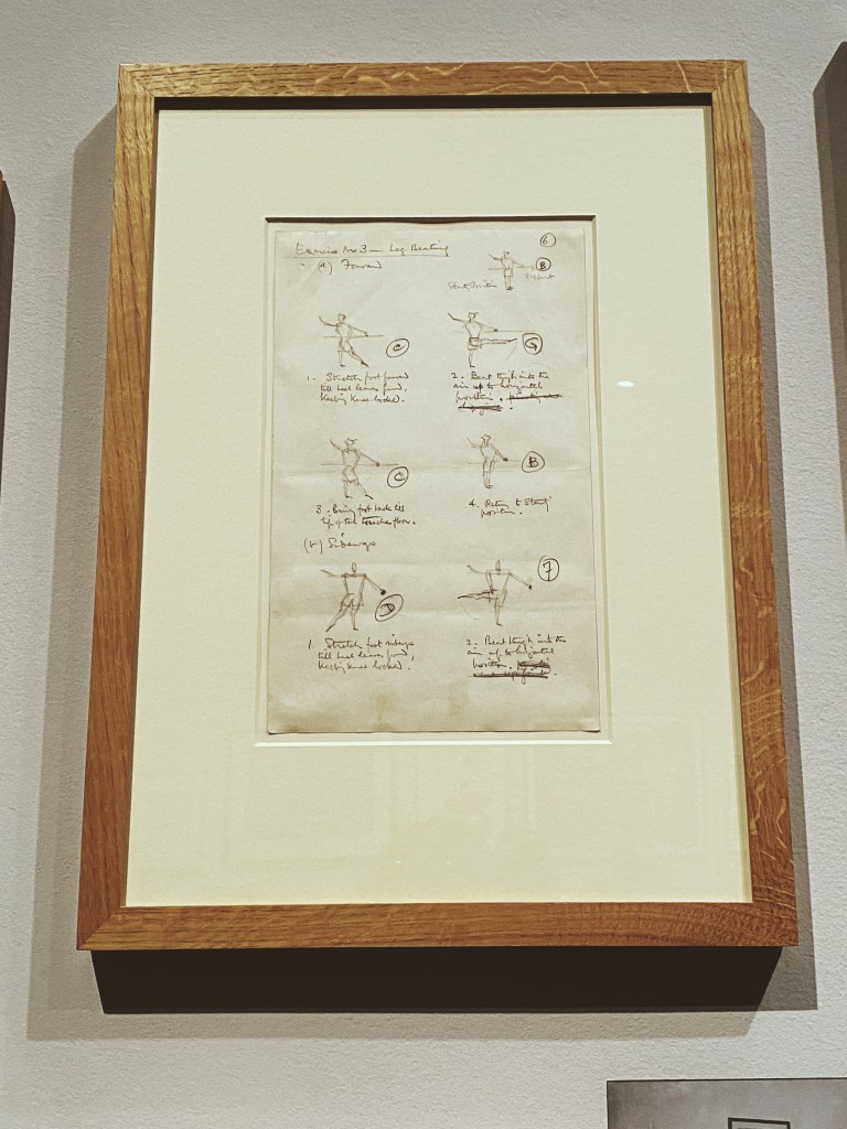 At the beginning of the Theatre and Performance section of the Victoria and Albert Museum, you’re greeted with two rooms that contain quiet relics related to ballet dance. It surprised me, honestly, that so much of the exhibit was dedicated to the study of ballet because it’s not something that I immediately associate with theatre, or at least, not as a thesis statement for a theatre exhibit. However, when walking through halls of dance costumes, I was struck by the tension of how small and fragile these dresses appear compared to the strength required of the dancers. Charts of exercises and photos of dancers in training line the walls as testaments to the years of work required to perform in this field.