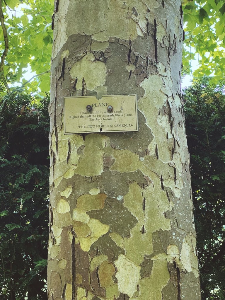 Tree at Anne Hathaway’s Cottage labeled with a corresponding Shakespeare quote.