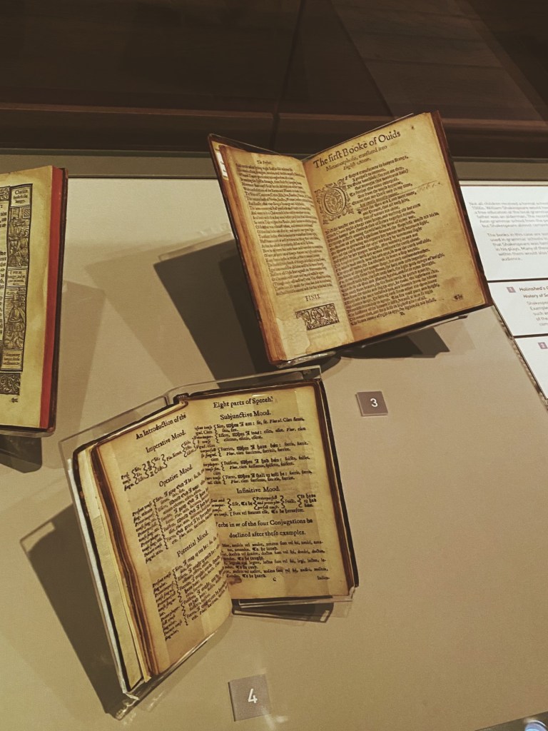I think my favorite part of what we saw, though, was a grove of trees at Anne Hathaway’s cottage that were labeled with Shakespeare quotes related to each specific variety (cypress, elm, oak, etc.). Something tells me that Shakespeare loved trees as much as I do if he was so intentional as to call them by name. One thing that stuck out to me about our tour of Shakespeare’s Birthplace, The New Place, and Anne Hathaway’s cottage was how Shakespeare both built off of the work of others and, in turn, inspired others to build from him. The Shakespeare Center contains a display of the books and stories that Shakespeare read in his early years, such as Ovid’s Metamorphoses and Holinshed’s Chronicles, which was interesting to see when considering how often Shakespeare used old stories as frames for his retellings on stage in plays like Hamlet and Romeo and Juliet
