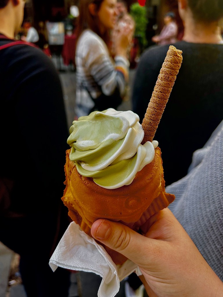 One of my favorite places that we visited was China Town which is right next to Picadilly Circus. I loved looking up and seeing all the beautiful red lanterns hanging over me as I walked. There were more Chinese restaurants than there were people in the streets. Our group had a difficult time deciding where to eat because of this and also because our dinner schedule was a bit thrown off track due to the drastic time change. Many of us weren’t heavily hungry so we decided to go inside a China Town Bakery and try Green Tea Ice Cream and Pork Pastries. The Green Tea Ice Cream was so tasty. The texture was very smooth and the flavor had a matcha, earthy taste to it that I loved. The ice cream came in a cute waffle cone shaped like a fish. I can’t wait to try more foods as we continue this trip.