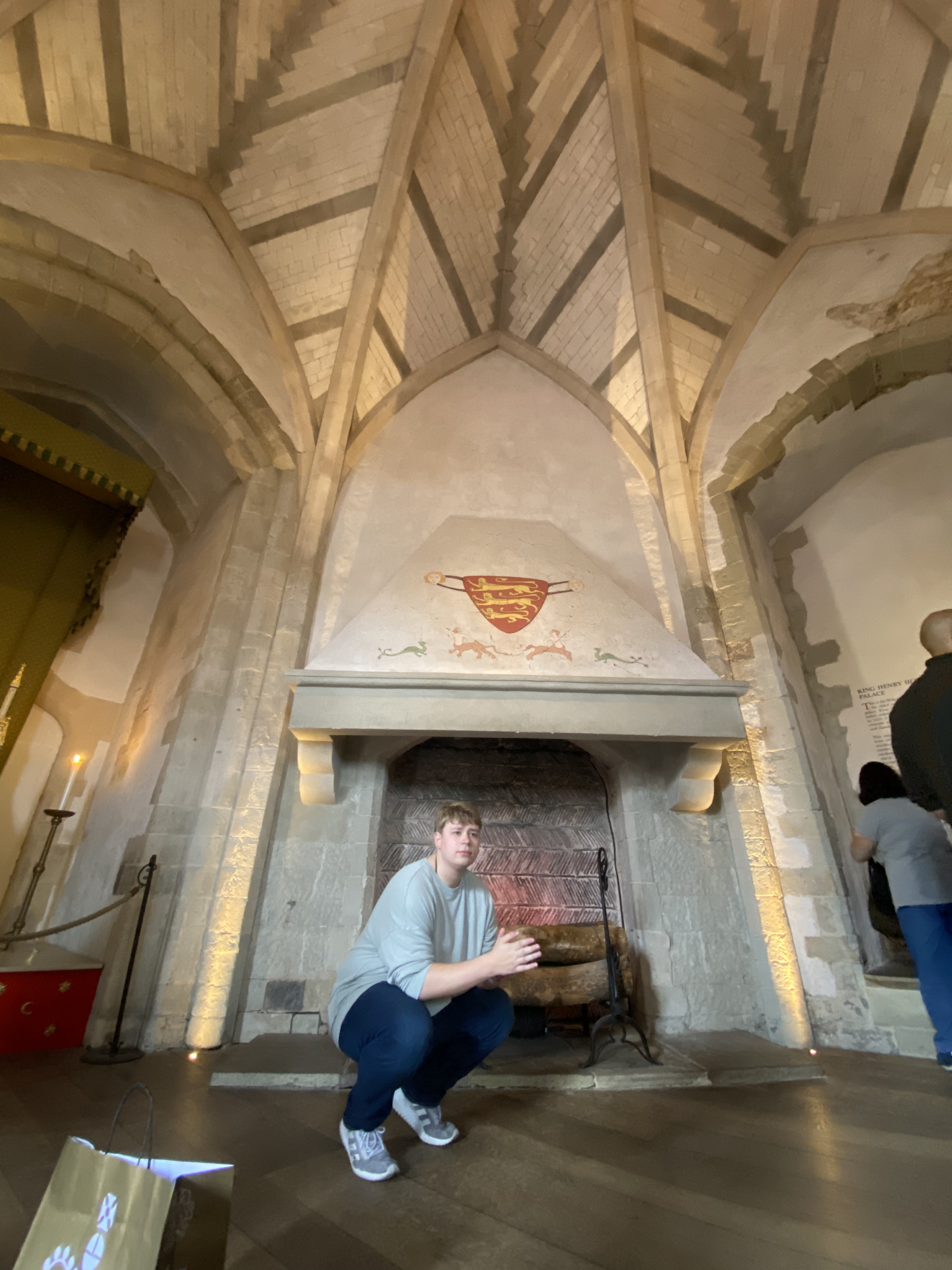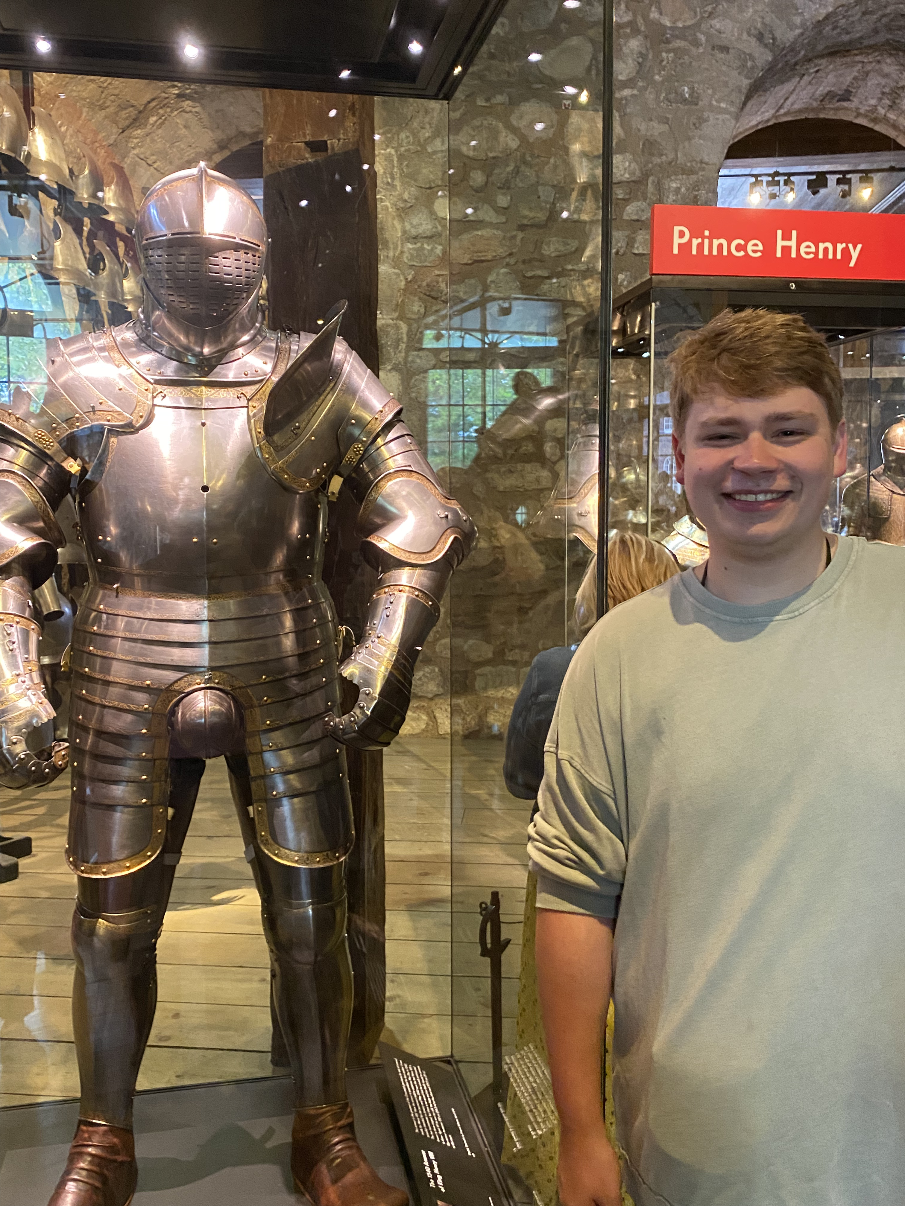 I learned a lot about British Culture regarding ancient armors and weapons during my Alex Ahuja-guided tour of the Tower of London. Unfortunately, due to the line which stretched down to the entrance of the compound, we were unable to see the Crown Jewels (which was fine by me, as I had already seen them before on my previous trip) but going through the White Tower was a very cool way to witness many different sets of ancient armor. My favorite (pictured below) was a set of armor, the only set of armor, which had a large bulge used to protect the wearer’s genital area. It was cool to see all of the different King’s various armor sets, for example Henry VIII’s and Edward II’s, and there was a display which held the armor that was worn by “The Giant and The Dwarf”, which reminded me of The Mountain and Arya Stark from the early seasons of Game of Thrones. Inside the White Tower there was also a toilet on a higher floor, which was seemingly used to dump the waste directly into what would have been the moat. It reminded me of other castle I have been in, where above the gates there would be holes to pour feces, boiling water, or other liquids to deter invaders and I find this to be a very silly tactic. After moving on from the White Tower, we toured The Bloody Tower and I read about how Ann Boleyn, the second of Henry VIII’s wives, was held captive there for 17 days after being accused of adultery, before being beheaded. I have always been interested in Henry VIII’s wives because of the musical Six, but specifically Ann Boleyn because of the TV miniseries which shares her name. Lastly, when my group was climbing some stairs to take pictures from the wall of the compound, we realized that a tour guide had pointed us out to a large group of guests who he was lecturing to and referred to Amelia as “her Highness” which was a very cool and unique experience, despite the group probably laughing at our “American-isms.” The Tower of London was a very cool historical site to visit which was both fun with friends and educational and I would recommend to anyone who is visiting the city.