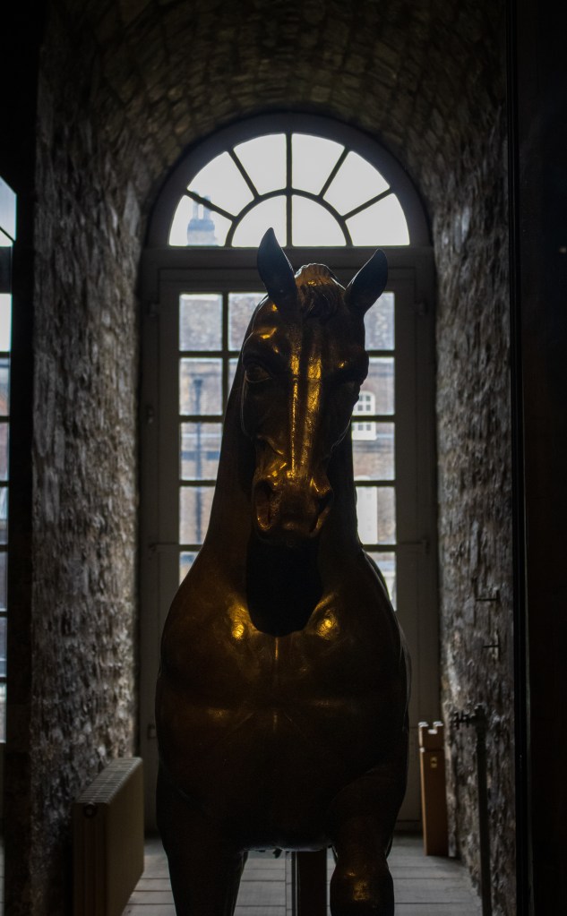 Yesterday we got to visit the Tower of London, which has been my favorite stop on our trip so far. We had just over two hours to spend in the castle, so rather than spending a large chunk of the time waiting in line to see the Crown Jewels, I decided to go with the group that wanted to wander around and see what else the place had to offer. Where we ended up spending most of our time was in the White Tower at the center of the castle grounds, a fascinating structure full of pieces of history and interesting corners. The first room consisted of several suits of armor, each with accompanying plaques describing who the armor belonged to. The best part was that many of the suits were posed as if they were riding the statues of horses that also filled the space. There were so many horses, one of which was getting some real nice back light from the window it was placed directly in front of (see below).