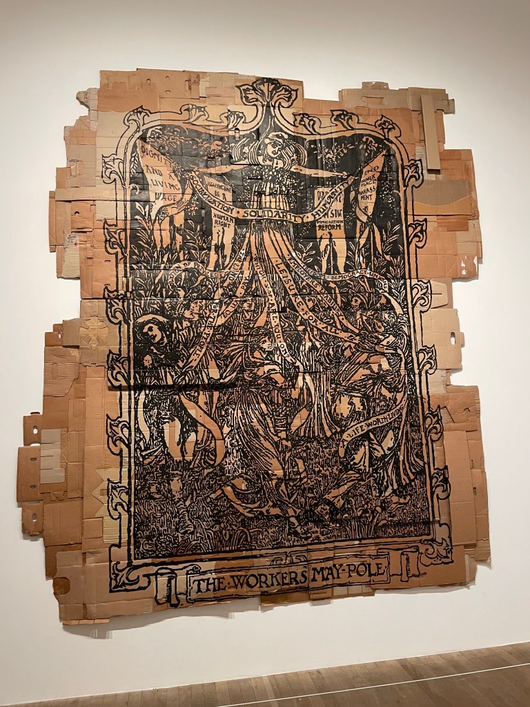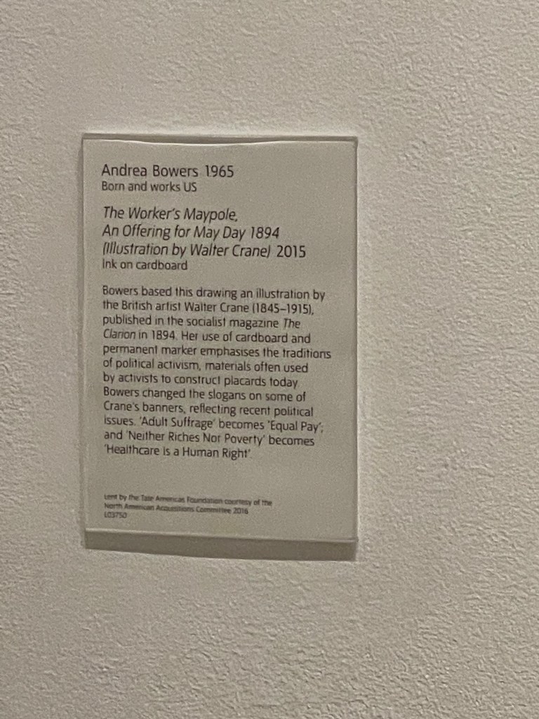 The first piece of art that caught my attention is by Andrea Bowers and was created in 1965. It was a bunch of pieces of cardboard stuck together and there was a picture drawn on it with sharpie. I liked it because it wasn’t a huge, expensive, flashy painting / design, it was a well thought out cheap and very well made design. I could tell that the artist put in a lot of time and thought into making it.
