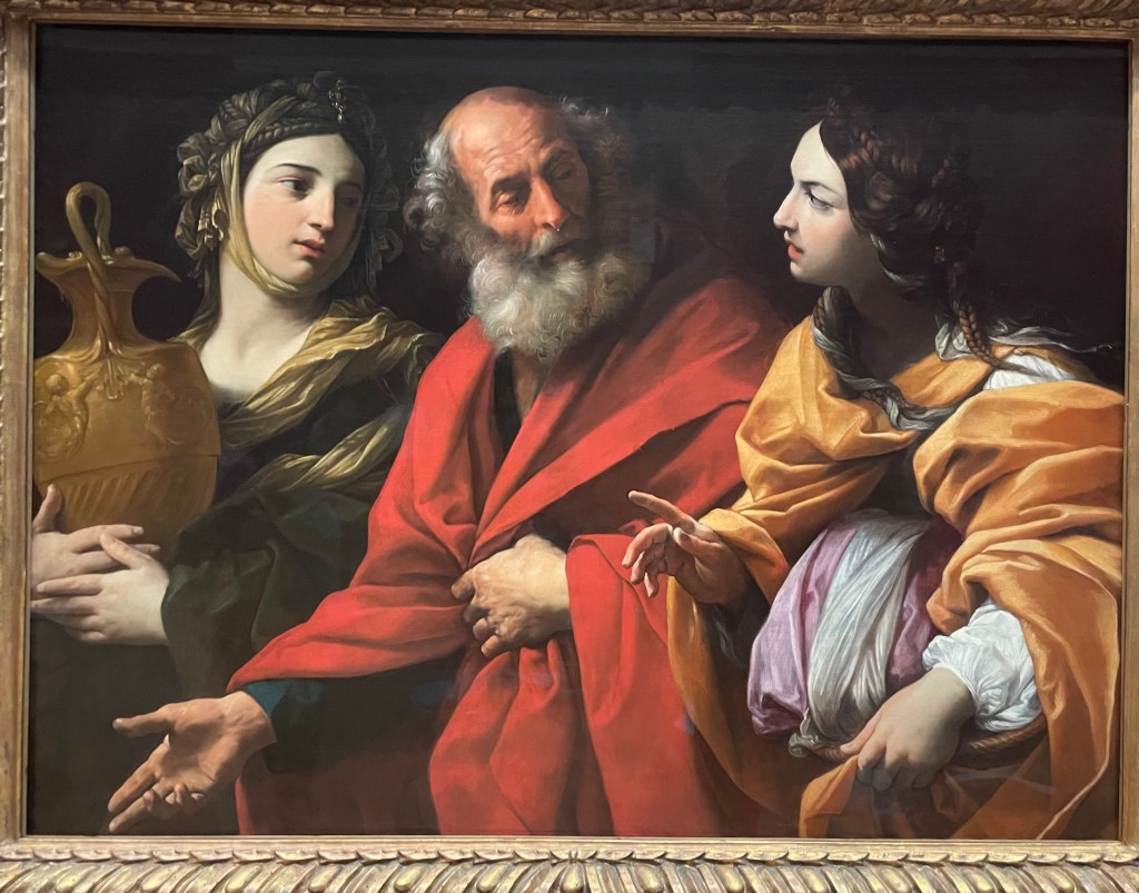 For academic purposes, I will also be looking at Reni’s “Lot and his Daughters leaving Sodom” which was painted roughly twenty years prior. At their core, both the paintings have similar subject matter. Mythology and Biblical paintings are often seen as adjacent when in comes to subject. Both paintings are also oil on canvas (I’m not sure if I saw any paintings that are not oil on canvas). Reni employs the same style for fabric in both paintings. This is most apparent looking at Europa and the daughter on Lot’s right, particularly since this daughter is draped in a similar orange to Europa. I was surprised to see how far apart these two paintings were created as the skill and stylistic choices are so similar. A strong contrast between the two artworks is that “The Rape of Europa” is much brighter than the scene from Genesis. The scene from Greek mythology is set against a bright blue sky with a sweet looking cherub (I’m assuming Cupid since: bow and arrow) almost hanging there translucently. Europa herself is clothed in bright pink and orange. Meanwhile, Lot and his daughters are placed on a simple black backdrop in muted tones. It is amazing how color theory works because it seems like the orange in the two paintings is the same yet due to their surrounding colors they take on different hues. It is also how neither painting seems flat, the people seem separate from the background, yet the rippling water in “The Rape of Europa” does not seem to have movement.