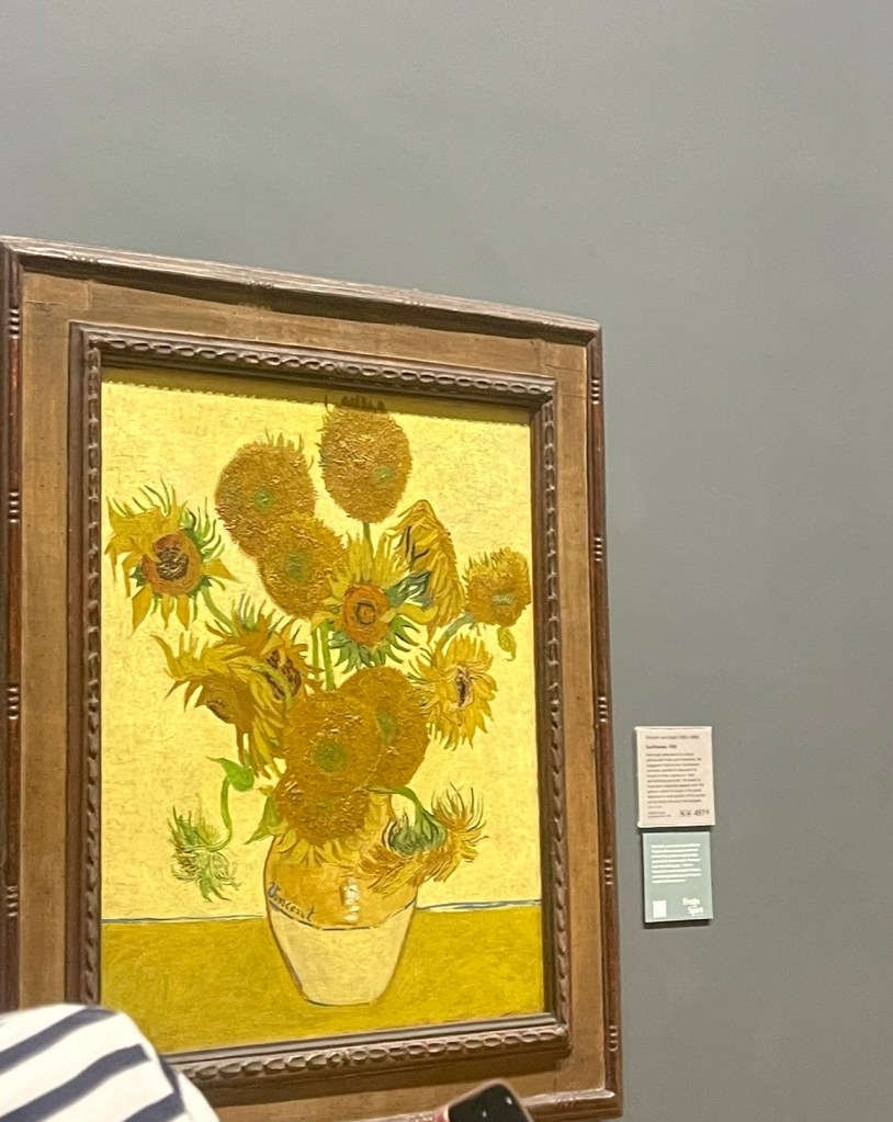 I also really enjoyed seeing Van Goghs Sunflowers. I have seen this painting online so much, so seeing it in real life was very powerful. I love and admire Van Goghs art style and how it shows his perspective of the world. It is inspiring seeing him paint sunflowers and use them as a symbol of hope and happiness even though he was in a dark place himself. It was said they express an “idea symbolizing gratitude”, which really stuck with me. Every little flower is different and unique and it reminds us to be grateful for everything, no matter small.