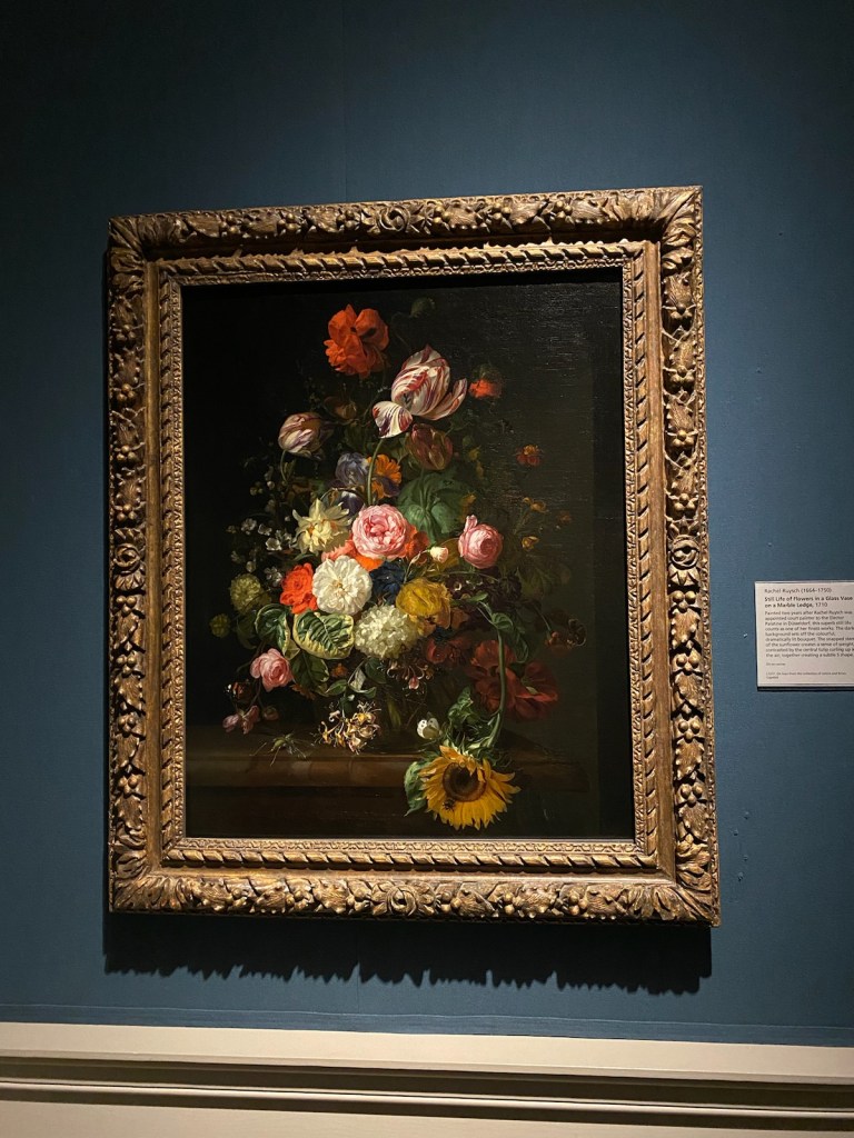 I also focused on the still life paintings within the museum, as a floral still life will always catch my attention. I noticed a beautiful Rachel Ruysch still life titled Still Life of Flowers in a Glass Vase on a Marble Edge. This realist painting pictures an abundant bouquet with a dark background. The colors were vibrant, and the detail was prominent. Like the Tiepelo piece, it has amazing pastel colors and told a story, even if it was just a still life rather than a mythological story. It was so exciting to see such a difference in pieces, especially works with such big names in the Gallery like Van Gogh and Monet. I can’t wait to go back!