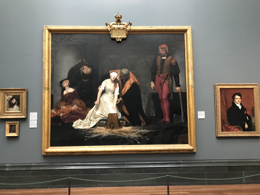 The most exciting moment of my day however was viewing the famous painting of Lady Jane Grey’s Execution. The Execution of Lady Jane Grey was painted in 1833 by Paul Delaroche. Lady Jane Grey reigned as queen at the age of fifteen for only nine days in 1553 until disposed by supporters of the Catholic Queen Mary. Many may recall in a previous blog post of mine that she was beheaded in the Tower of London. The French painter, Delaroche was famous for his scenes of British royalty, especially those who were doomed or dying.