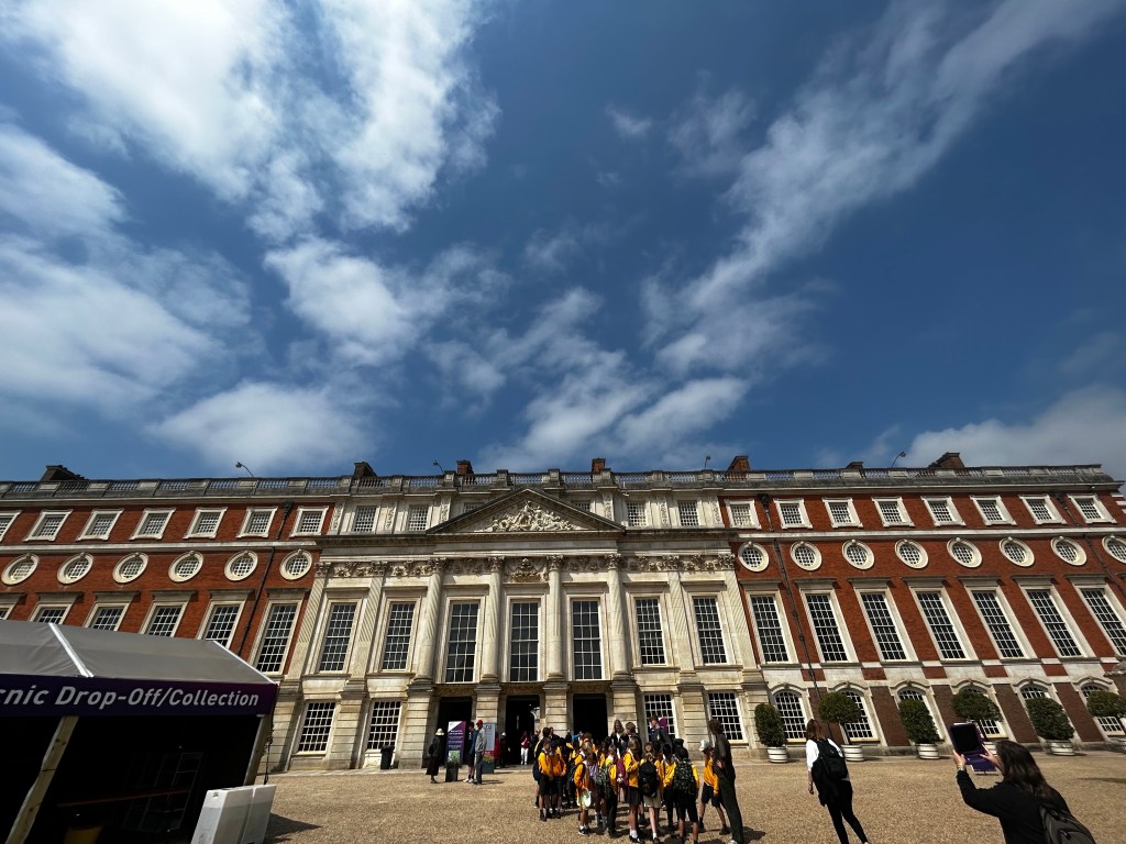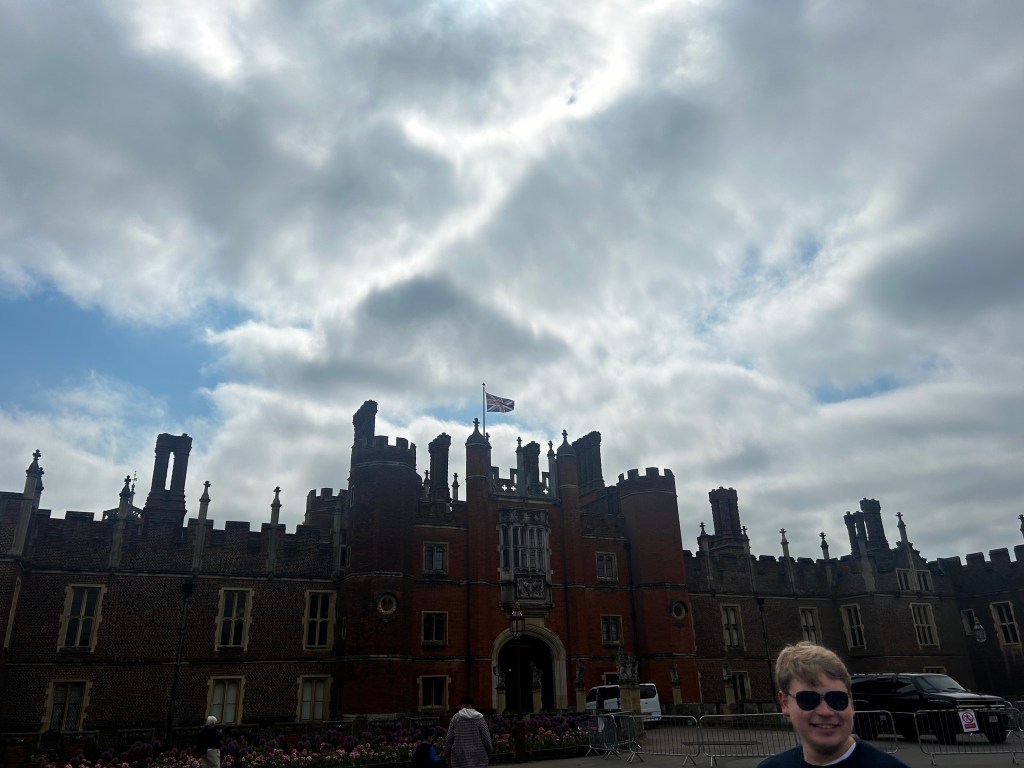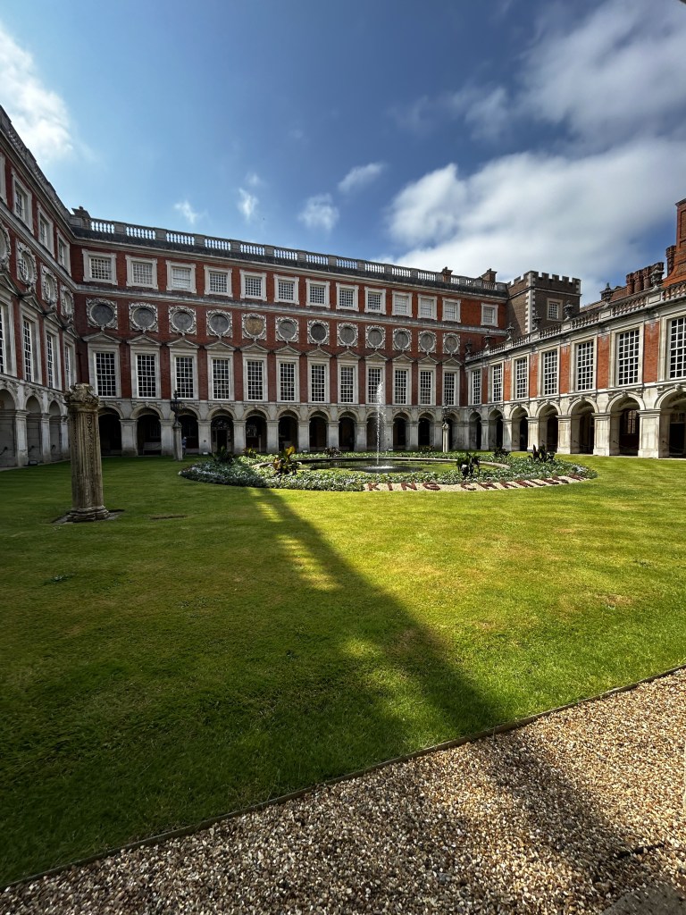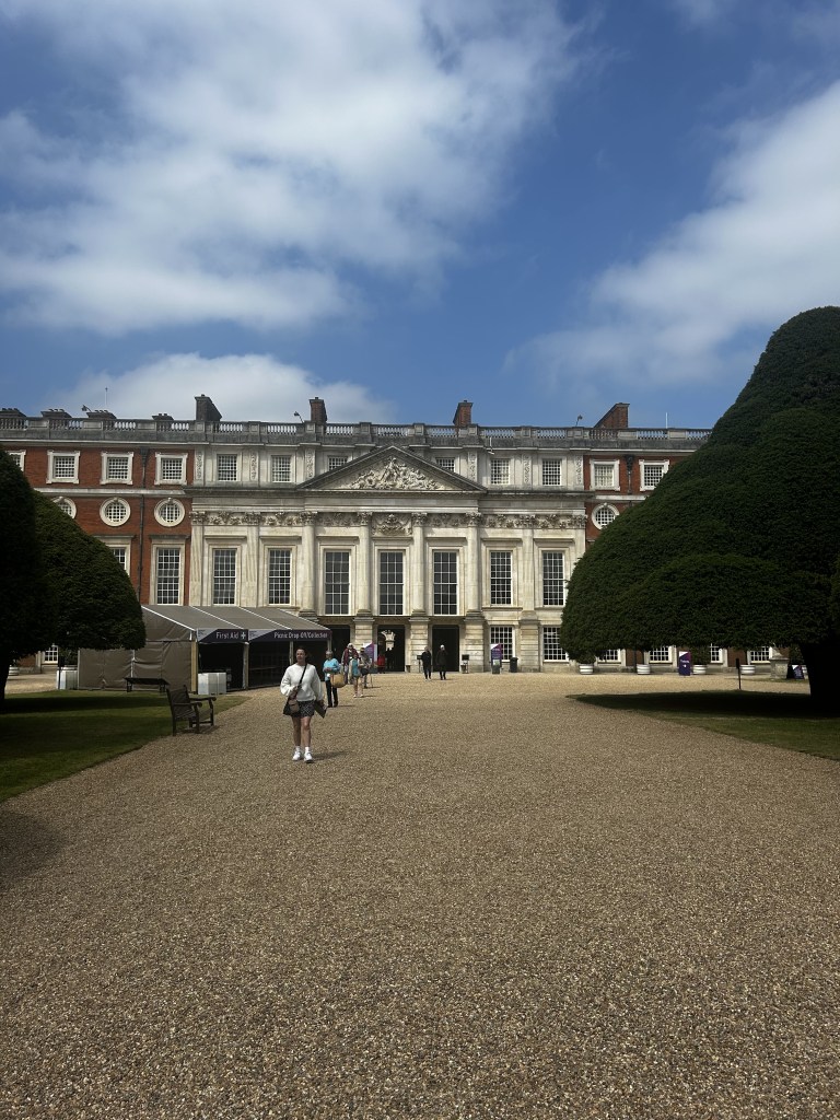 Today, our group of students set out on a day trip to the Hampton Court Palace just outside of London. The palace is located in the London Borough of Richmond upon Thames, 12 miles (19 kilometers) southwest and upstream of central London on the River Thames. We took the train to London. It was a very nice and short train ride. I rested my eyes and listened to music on the way there. Once we arrived, we made our way to the palace. I was so eager to come here because my favorite tv show, Bridgerton, was filmed here. The Privy Garden serves as the exterior of Queen Charlotte’s palace, and is featured in a number of Bridgerton scenes, including as the backdrop to Viscount Anthony Bridgerton’s lavish wedding to the season’s Diamond, hosted by Queen Charlotte herself.
