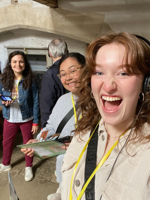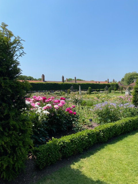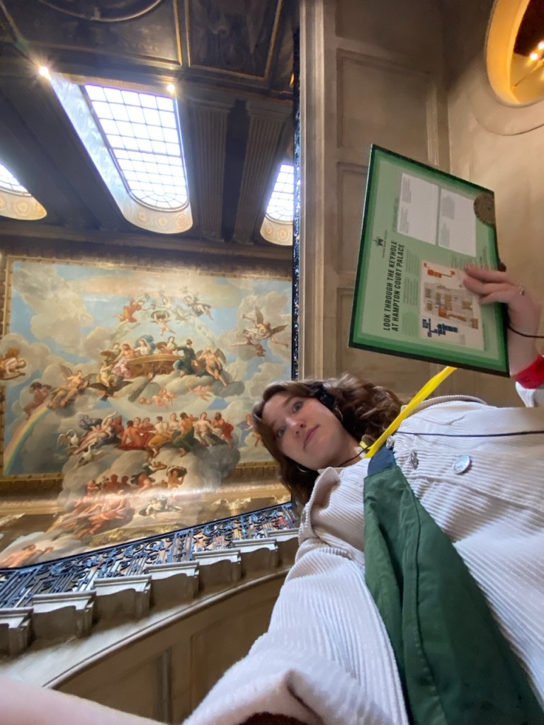 Exploring Hampton Court Palace was quite a trip. We started our morning with a short and sleepy train ride to a beautiful small town with a river running through it. Once we got to the palace, I was overwhelmed by the colorful view of rainbow flowers in front of the building. The building was a grand red-bricked structure surrounded by many different intricate gardens. We followed the comforting wood fire smell and started our tour in the kitchens. After touring multiple rooms and closets, including a chocolate room and a red velvet toilet, I was in disbelief that this place was real. A king having a space devoted to 24/7 luxury chocolate sounds just like a recurring dream I had as a child with a dangerous sweet tooth. There was a personal chapel adorned by blue ceilings with white stars and holy water by the door. A specific hall was said to be haunted by the fearful screaming of the fifth wife Catherine Howard. I saw many ceilings full of Verrio paintings depicting mythological stories that the King happened to relate to. I saw hundreds of paintings that had been kept amazingly well and were mostly of female courtiers. Though I understand prop meat pies were added, the palace was so strangely fresh looking. It felt more like a replica castle rather than one which was actually built in the year 1699. The paintings were too shiny, and the floors did not nearly creak enough. The gardens were beautifully kept and extremely impressive in how odd the design was. The rose garden blew me away and I couldn’t help but think of all the period movies and shows it reminded me of. The Hampton Court Palace compared to the other landmarks we have seen felt like a newly flipped fixer-upper. I would live in it if they let me, well, only if the chocolate room is available.