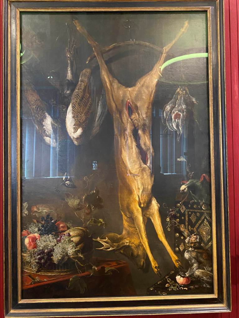 When first strolling through the museum, I was desperately looking for clocks so that I could talk about Back to the Future: The Musical, which is one of the best musicals I have seen since Kinky Boots. Instead, I found a painting called “Still Life with a Dead Stag” and as soon as I saw this, I instantly thought of PunchDrunk: The Burnt City. I was a little disgusted, once I took a step back and realized that it was a painting of a gutted deer carcass hanging among other dead animals, but that quickly faded when I thought of The Burnt City, and specifically Artemis. Artemis was one of the twins in that show, who wore matching outfits with her brother, Apollo, and I followed her around for a large portion of my time in the experience. While I never followed her to Troy, I did follow her back to a quieter room, where the actress was (more or less) able to recoup for a moment before beginning the loop again. In this room, there was a small cabin that one would be able to crawl through, and this cabin was adorned with lots of animal skins and hides. The inside of the cabin was similarly decorated but had animal tusks and horns strewn around the floor and on the walls as well. This is what made me realize that I was following Artemis, the goddess of the hunt. This painting reminded me of that room in particular because when I approached it, I actually thought that it was representing Artemis in some way, however after reading the plaque, it is more representative of “worldly pursuits” and “fleeting pleasures.” That line really spoke to me regarding hunting in general, and how it can be seen as a sport, rather than a necessity and that people treat the killing of these animals like a game and, personally, I feel like that is very against – for lack of a better phrase – how nature should be interpreted. Anyways, there is a funny little monkey in the corner of the painting too that “represented greed” but I just thought he was a funny little guy. The End. (classic ending).