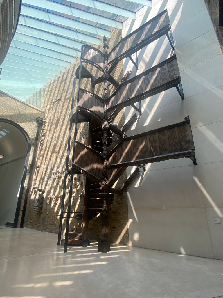 Naturally, once I realized there was an architecture exhibit, I tried to make my way to that area of the building. On that journey, I ran into a lovely space that had been converted from an outdoor alleyway into a useable museum space. Inside this space, there was a set of circular wooden stairs. They were quite beautiful, and it made me think of some of the shows we had seen like 2:22 and The Mousetrap. Both of these shows have some sort of upstairs area that is hidden to the viewers. Of course, there’s not physically an actual upstairs, but the allusion to a staircase gives audience members the ability to imagine what might be on another level. It’s quite fascinating to think about how everyone accepts that there is an upstairs even though we all know there isn’t. That’s the beauty of crafting a good set.