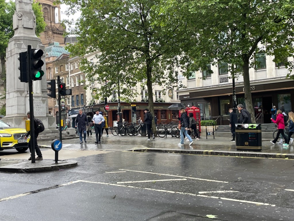 After we left the tube station, I got to experience London. I had always heard that big cities were dirty, but I was happily surprised to see that public areas in London are kept very clean except for the occasional pile of trash bags. The environment is accessible and beautiful. Even the ground is pretty. The sidewalks are made of stones, not giant slabs of concrete.
