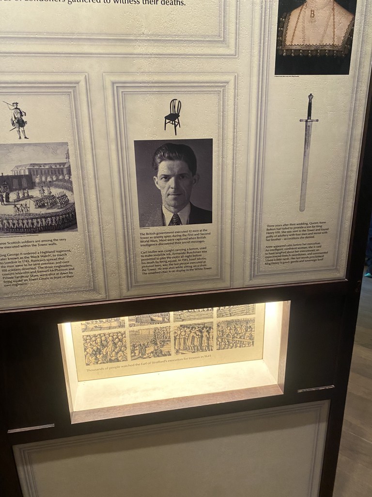 Josef Jakobs, the man pictured above, was executed for his role as an enemy spy in World War II. He was the last person ever captured by the British government to be executed at the Tower of London. In the year 1941, he was killed via. firing squad while sitting in a chair. That chair now on display at the White Tower portion of the exhibit.