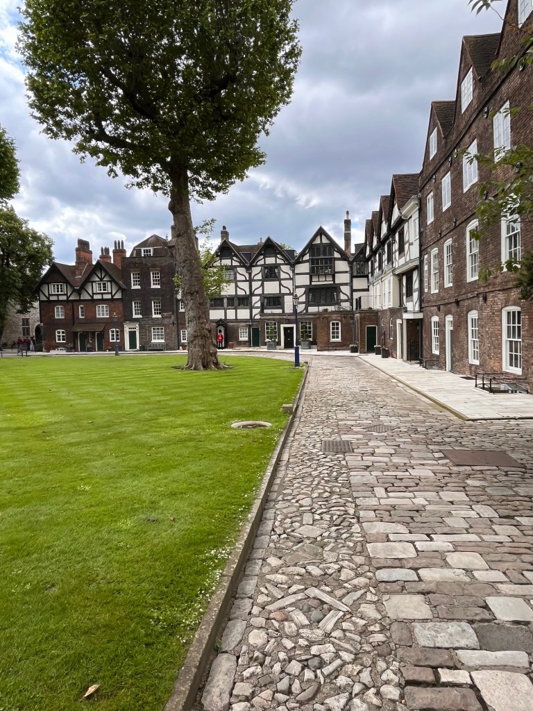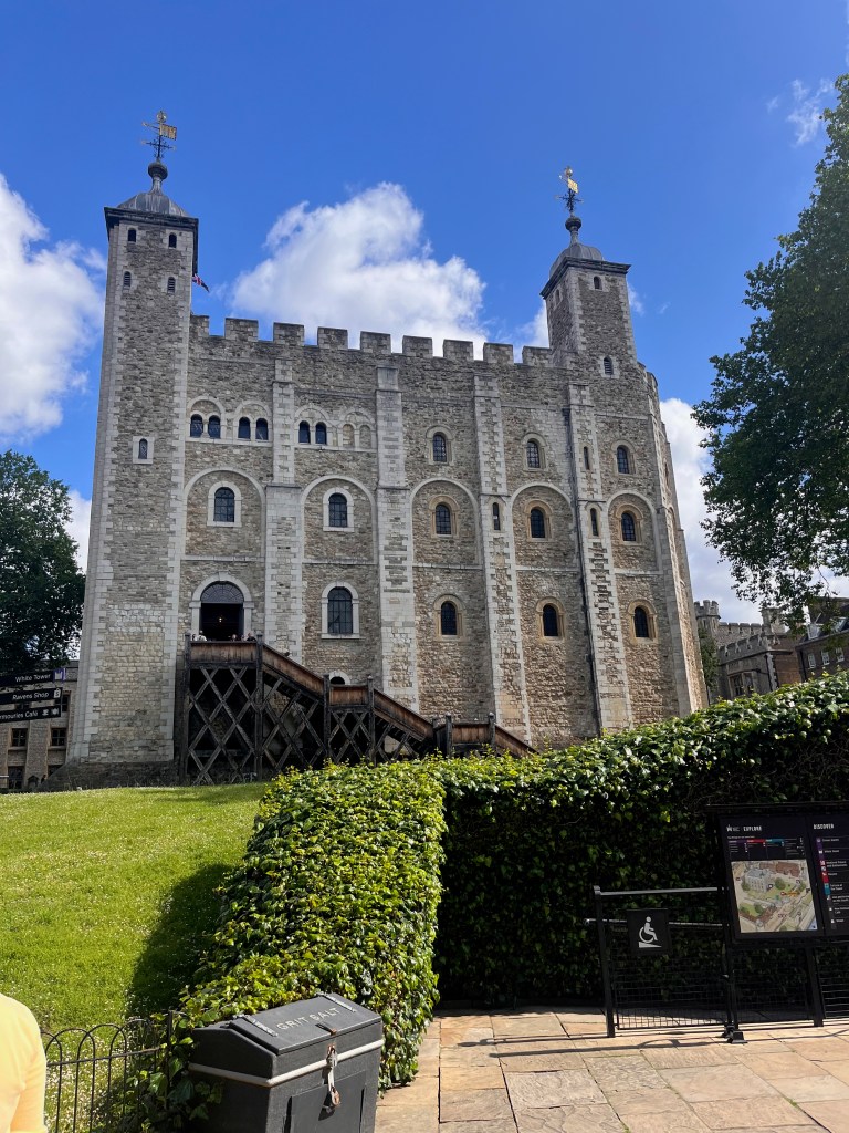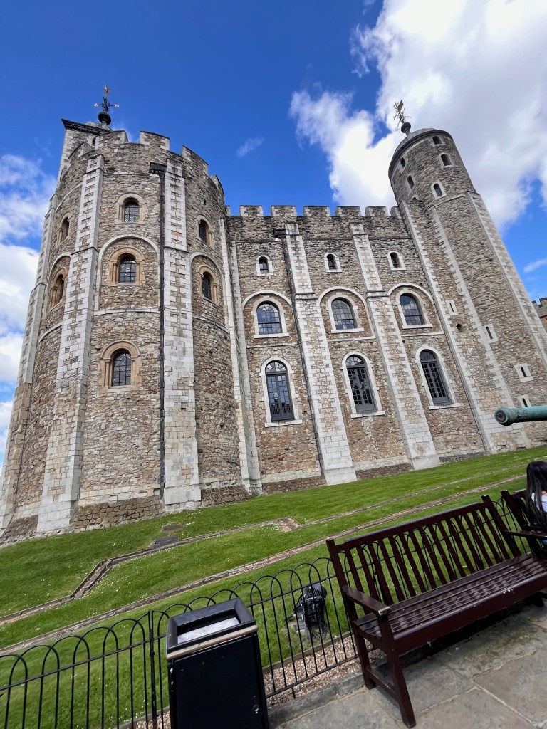 Some other things I enjoyed seeing and learning about while at the Tower included the Crown Jewels, the architecture, and the flowers. I never realized how extensive the collection of the Crown Jewels is. I’ve always thought of it as just a few crowns that the royals wore, but it also included regalia worn by royalty and those closely associated with them during ceremonies, serving platters (including a HUGE wine bowl that can hold 240 BOTTLES of wine), and other significant items used by royalty for ceremonies, dinners, and more. The architecture was also fascinating because the Tower was expanded over years and years. As a result, you can find Tudor, Medieval, and other styles all present within the same complex. The architecture paints a sort of timeline of The Tower of London, and it makes for a great photo op, as you will see below. Lastly, I just loved seeing all the beautiful flowers throughout the complex. It was a rare sunny day in London, and that combined with the flowers made it a beautiful time to explore.