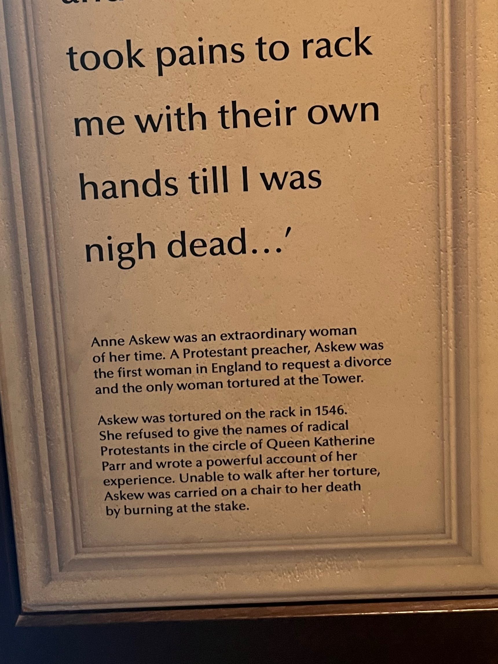 One of the most interesting prisoner profiles I found while touring was that of Anne Askew. She was a Protestant preacher, and the first woman in England to ask for a divorce. She is also one of the very few people to ever be tortured at the tower. I feel like The Tower of London has forever been a place associated with torture and gruesome murder, so I was surprised to learn how little it actually took place when considering the number of prisoners that were at one time held there. Anne was tortured in the hopes that she would give up the names of Protestants in Queen Katherine Parr’s inner circle, but she never did. Anne withstood immense torture and pain to protect those individuals, and in the end, she was burned at the stake for it. Reading stories like her’s really gives one some perspective on how brutal life could be for people who got on the wrong side of royalty.