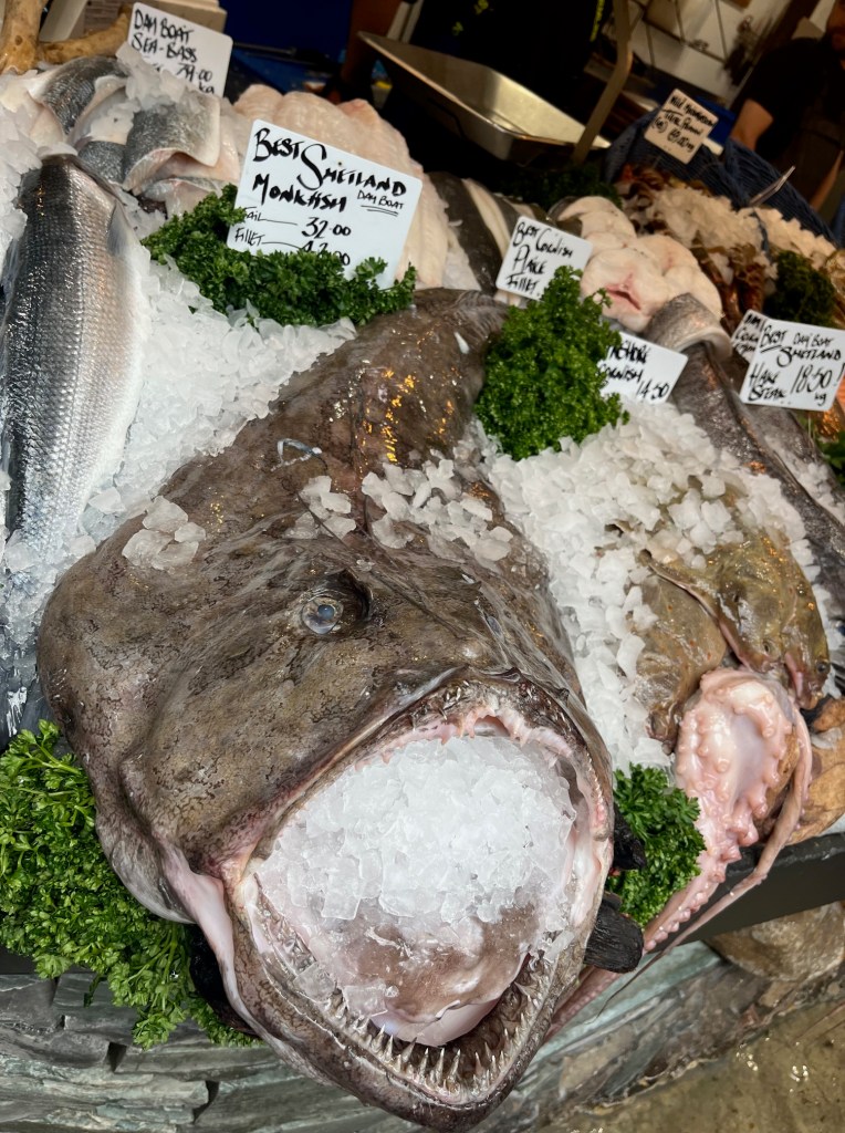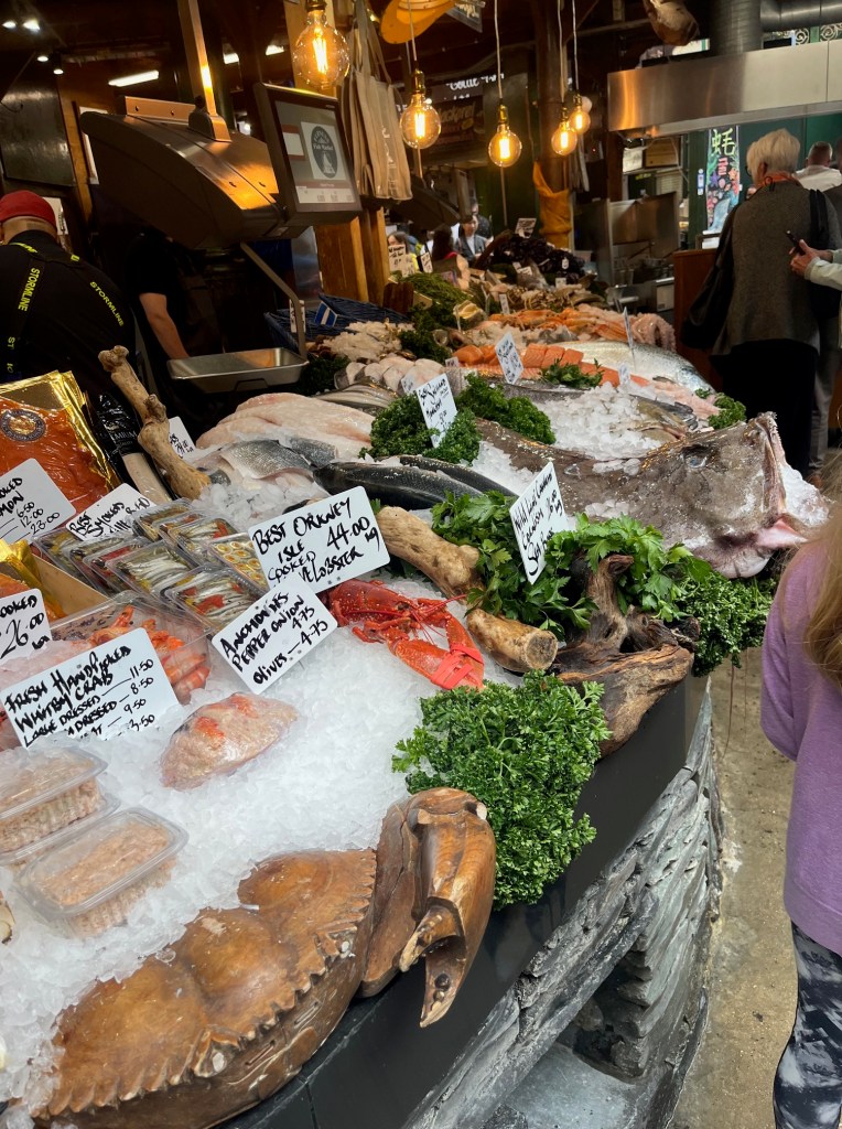 I had so much fun walking around this food Diagon Alley. I thought the architecture of the market was extremely interesting. It was very industrial in nature with green metal beams arching over all streets. Edison bulb lights hung from beam to beam giving an artistic atmosphere. The ceiling was made of glass windows, similar to a greenhouse. Between the ceiling and the colorful food, I felt like I was wandering through a tasty garden. The streets were packed with hungry guests. I lost Shawn and Courtney several times touring the streets. People pushed and weaved between a sea of heads and shoulders. People were shopping for hot and ready food but also for fresh farmers market ingredients. There was a shop that sold fresh sea food. There was a monk fish so large it could swallow a small child.