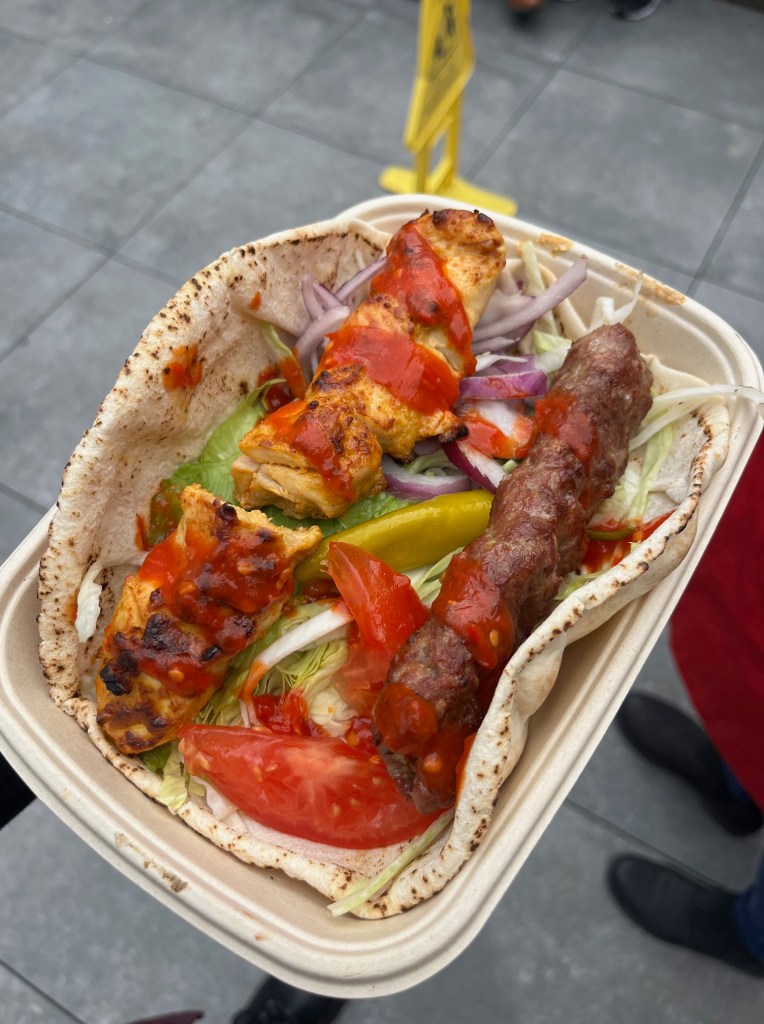 I did want to try something new, so I tried Iraqi food for the first time. I got a lamb and chicken grilled kebab. Inside were veggies such as cabbage, onions, and peppers. Drizzled with chilli sauce on a flat bread tortilla, this kebab had the perfect balance and melted on my tongue. The man who was preparing it put the meat over a rotating bed of hot coals. It spicy savory scent.