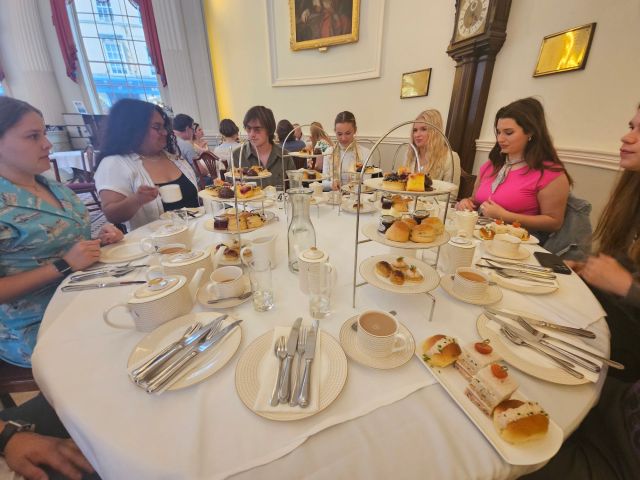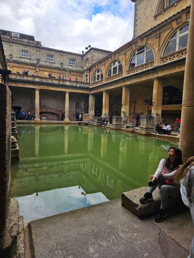 We took a day trip to the city of Bath yesterday. We got on the train, which was very nice, and rode it for about an hour and a half to Bath. On the way I started reading Agatha Christie’s “And Then There Were None” which is so good, but I have not finished yet so no spoilers! Once we stopped in Bath we walked towards the actual Roman Baths. The architecture was so beautiful, it was mostly all the same tan stone, but varied from plain to very intricate. Particularly the square where the Bath and Pump Room was, there was a building—the Bath Abbey—that was covered in designs of angels climbing up the walls, larger figures, huge glass windows, and a large wooden door carved with more art and symbols. It was really a beautiful building, most comparable to St Paul’s in London. As much interesting and varied architecture there is around London, that church has still been one of the prettiest to me. Inside the Roman Baths was really interesting. I have been to Bath before, but it was about 10 years ago, and my dad reminded me that during our visit the Bath was actually drained for cleaning. This time, though, it was not! It was full of bubbly green water, which sounds gross but actually looked sort of inviting. The main bath room was surrounded by various other rooms such as a massage house, cold plunge, gym, and sauna. They were all made of stone that was broken down a bit. There were signs everywhere warning of uneven ground because of the state of the old stone floor. The massage and gym rooms had these very cool projections of people working out or getting a massage dressed in what they would have worn. We had a headset where you could type the corresponding number to hear a description of what you were looking at like a guided tour. When I was younger and my family and I would go to museums I never liked those things, but now that I am older, I really liked learning about it and the headsets provided some very interesting information. The Bath serves the Roman goddess Minerva and once housed a gold coated bronze statue of the goddess. People would come to praise and worship her, giving her offerings of coins, dishes, and even what they call cursed tablets. People would write messages to Minerva asking her to punish someone who has wronged them, usually stolen items. I felt like I could really imagine the people going to the baths just on a normal day. Now of course I can’t not mention the tea. We got to have high tea at the Pump Room! I thought we were going to get just tea and scones, but we ended up having the whole set up. There were so many yummy treats as well as the tea and scones. The scones were delicious, with clotted cream and strawberry jam. I got Darjeeling tea that was actually the best tea I’ve ever had in my life. We also had music, there was a trio playing the violin, cello, and piano, I even recognized some of the songs I knew how to play. The room was beautiful, and it was one of the most enjoyable parts of this trip yet. It was just so nice to all be there as a group enjoying the splendor of high tea. The only thing that could have made it better was some proper dress—I wanted to be wearing a big, corseted dress! I was sad to leave, Bath was so much fun and a relaxing break from the vibe of London!