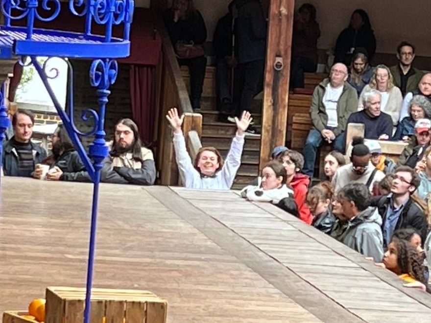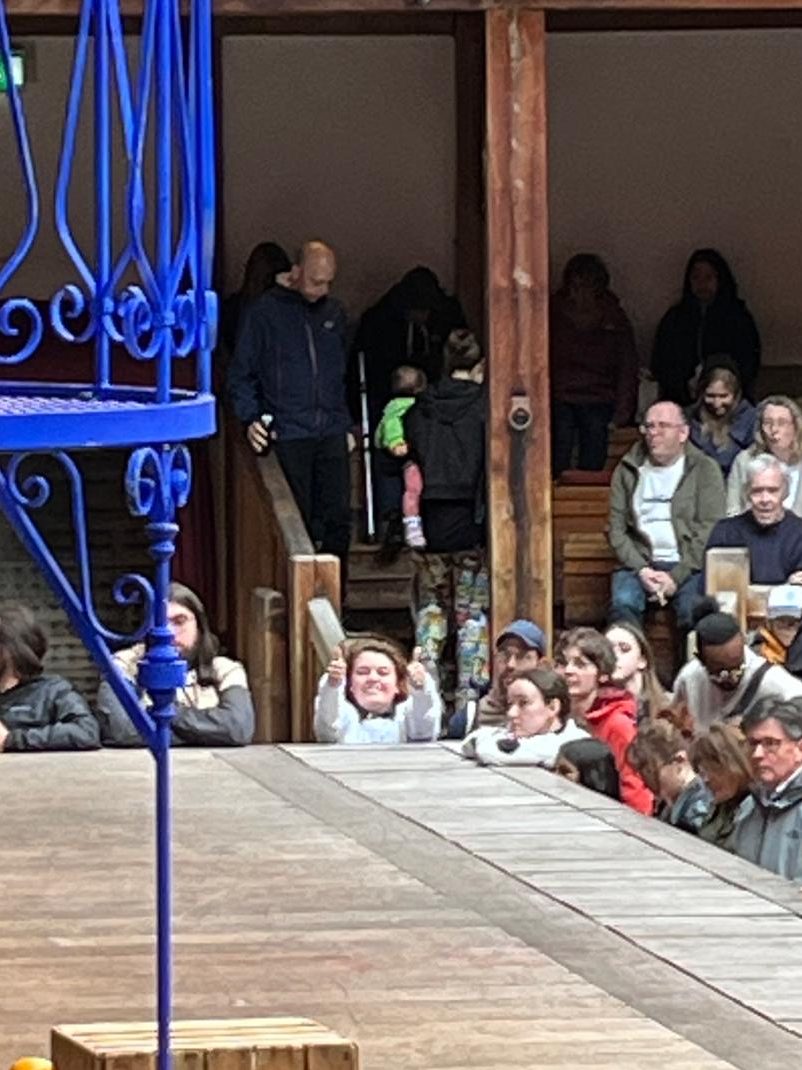 I loved being an official groundling!! I was so grateful to be so close to the action, and also to be a part of the action. Beatrice used my assistance to get back onstage during the production after hiding and slinking around the crowd to overhear Hero and her maid’s conversation. She whispered for me to help her after she jumped up and couldn’t quite get the rest of her body on. I rugby lifted her up there and pushed her to slide the rest of the way. It was one of the most hilarious and lucky things to ever happen to me. I saw all the minor and major details of the costumes with their intricate construction, fabric patterns, and jewelry. They spared no expense on the elaborate costumes. One costume that comes to mind is Beatrice’s blue and gold dress she wore to Hero’s wedding. Each rhinestone on the dress was placed very specifically because the fabric didn’t have a specific pattern print. The cobalt and gold that climbed up her dress were cut and stitched onto a cream-white dress. It was beautiful and had such an effect up close.