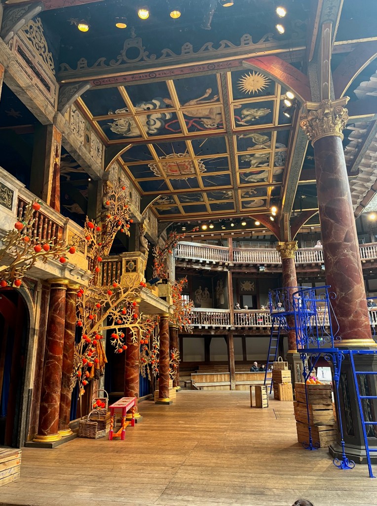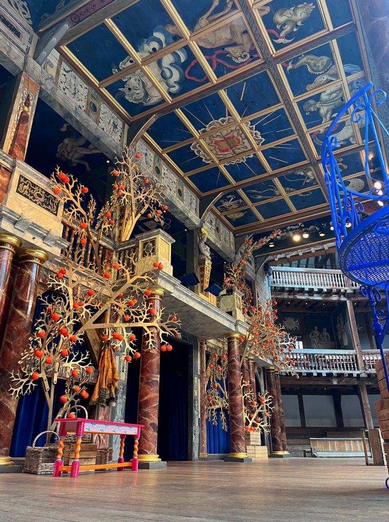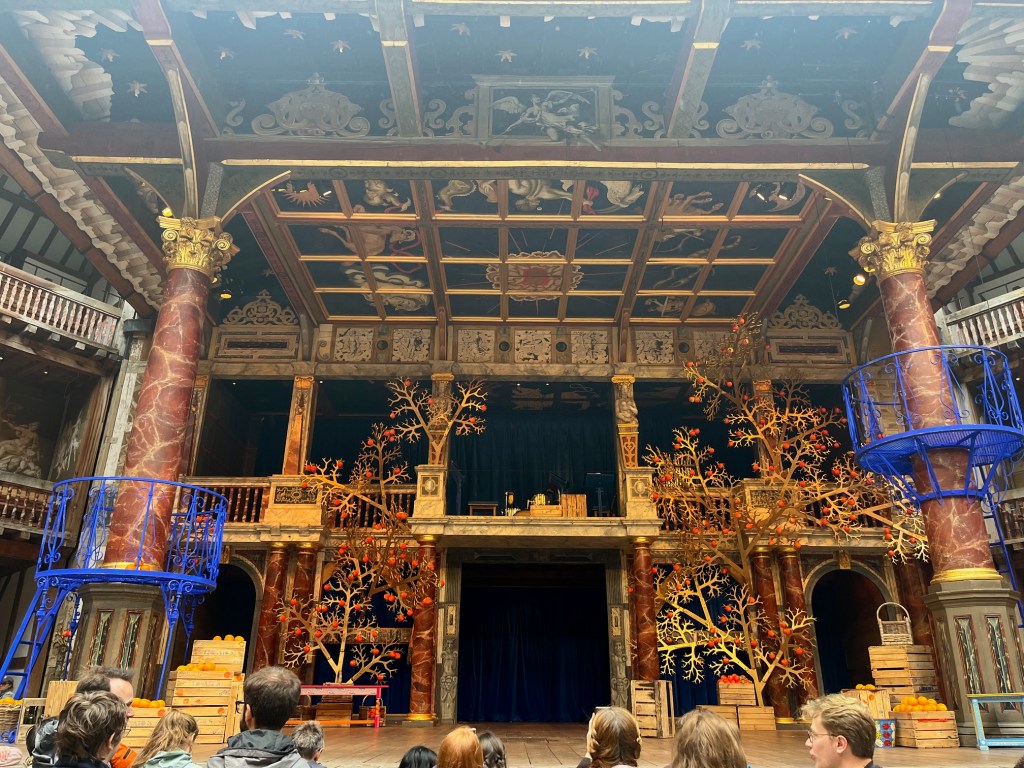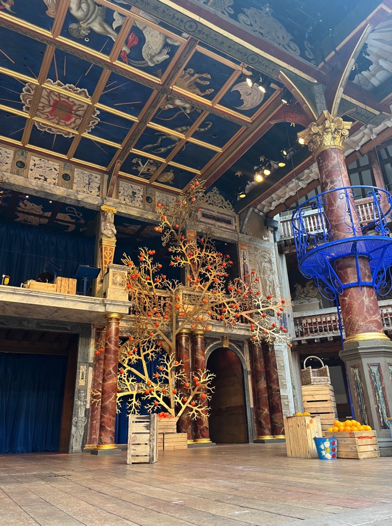 This version lived up to the production that I envisioned. It surpassed my expectations. I loved every second of it and laughed for most of the production. The set was just what I had imagined for Messina, Italy. It was so artistic and the colors were so polarizing that it was just incredible. The contrast between the bright orange to the cobalt was genius. The way they incorporated the orange orchards from the written play was a beautiful way to preserve the tradition of keeping Shakespeare’s plays fairly set-less and prop-less in the Globe but appealed to the eye so well. This play was so visually fun to watch as the actors could play with height with the small circular balconies attached to the huge iconic pillars of the stage. It was a wonderful element that gave the stage so much dimension for what I would consider a fairly plain stage.