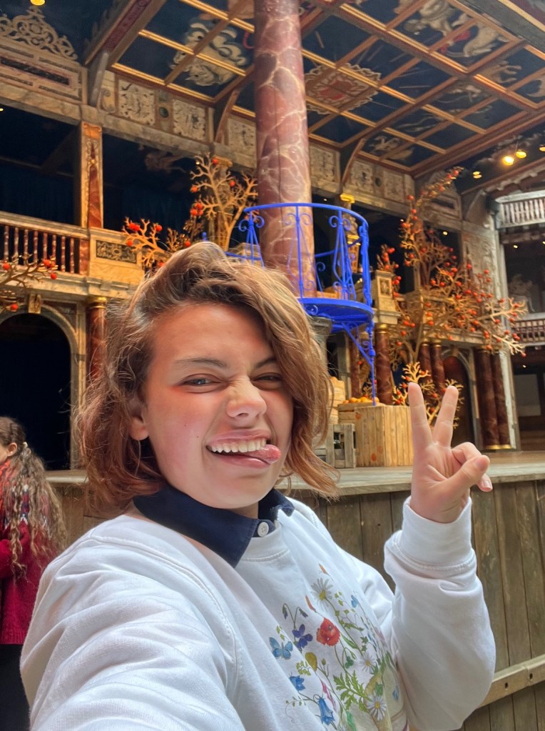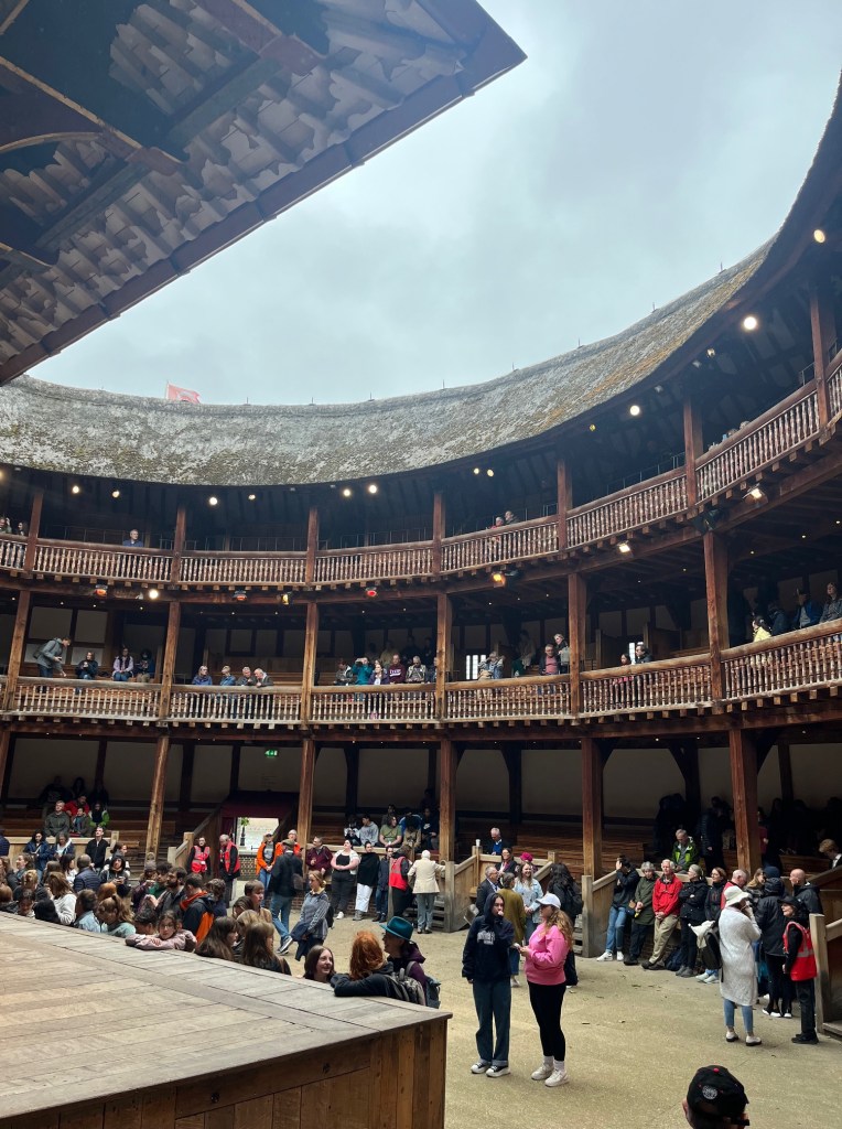 To be in a building that is an exact replica of the one in which Shakespeare’s plays were performed in the 16th/17th century took me to another time. I played a game with myself as I gazed up at all the upper seating with my fellow groundlings, imagining the atmosphere of the past while emersed the Elizabethan architecture. I saw the peasantry audiences crowding the yard and the wealthy filling the seats. I will say, that the pit did not have the signature smell that scholars said it did back in the day of garlic and ale, which is fine by me.