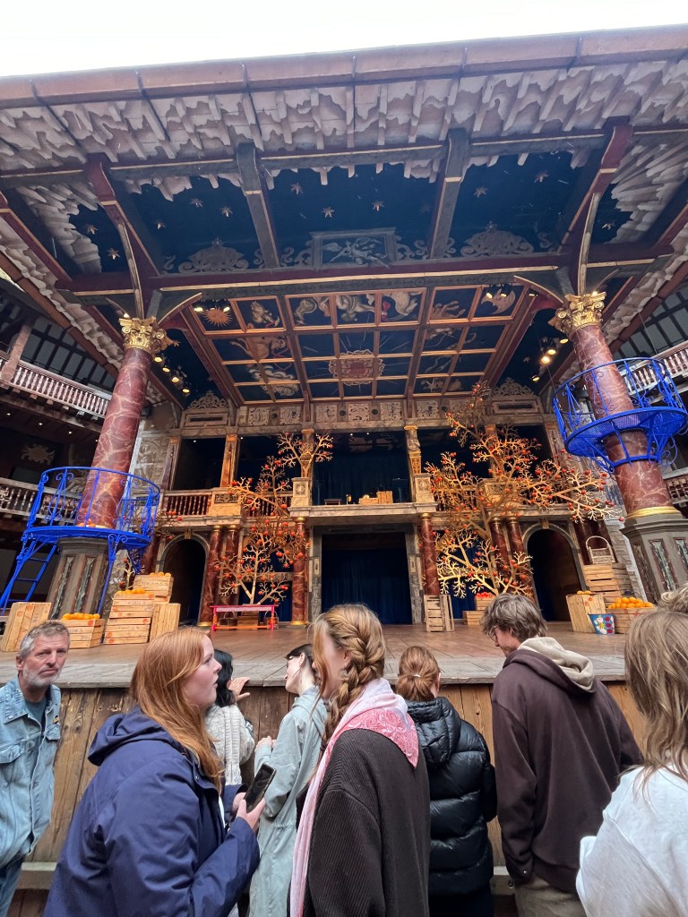 My first thoughts were when I laid eyes on the stage. SHAWN WAS WRONG. I fully went into the globe, with the expectation of absolutely no set or props. Instead, the stage was beautifully set, with an abundance of oranges in crates, gold orange trees, and bright blue balconies. The stage itself was beautiful in its architecture, its detail and color made it so unique to all the venues we have been in. Which made the set pieces on top of the stage, stand out even more.