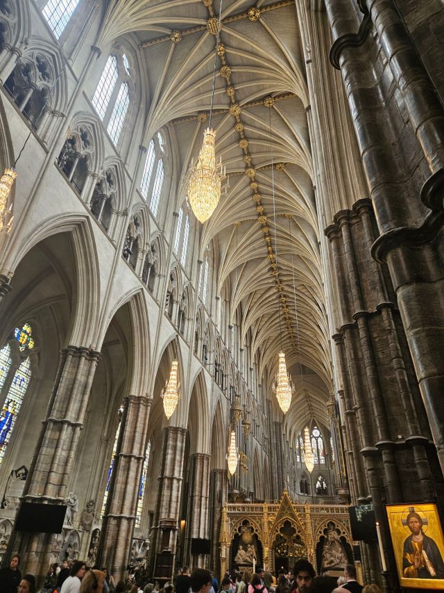 Today we went to Westminster Abbey. Molly was our tour guide again, and she took us through the abbey and told us about all we were seeing. The architecture was so beautiful! I loved the style, which she said is “Early English”. Particularly the ceilings, I love that interesting shape. I also love stained glass windows, so I liked looking at the incredible detail that was all throughout the abbey. There were gravestones everywhere on the floor, as well as rooms housing the tombs of Elizabeth I, Mary Queen of Scots, and a few others. While I was told beforehand that there was a lot of people—scientists, artists, poets, etc., I was still surprised by just how many were squeezed in there. There was practically no free space, all of the floors had plaques dedicated to someone or another. A lot of names I did not recognize, but some I did. There were a few names I did not expect to see there and found it very interesting.