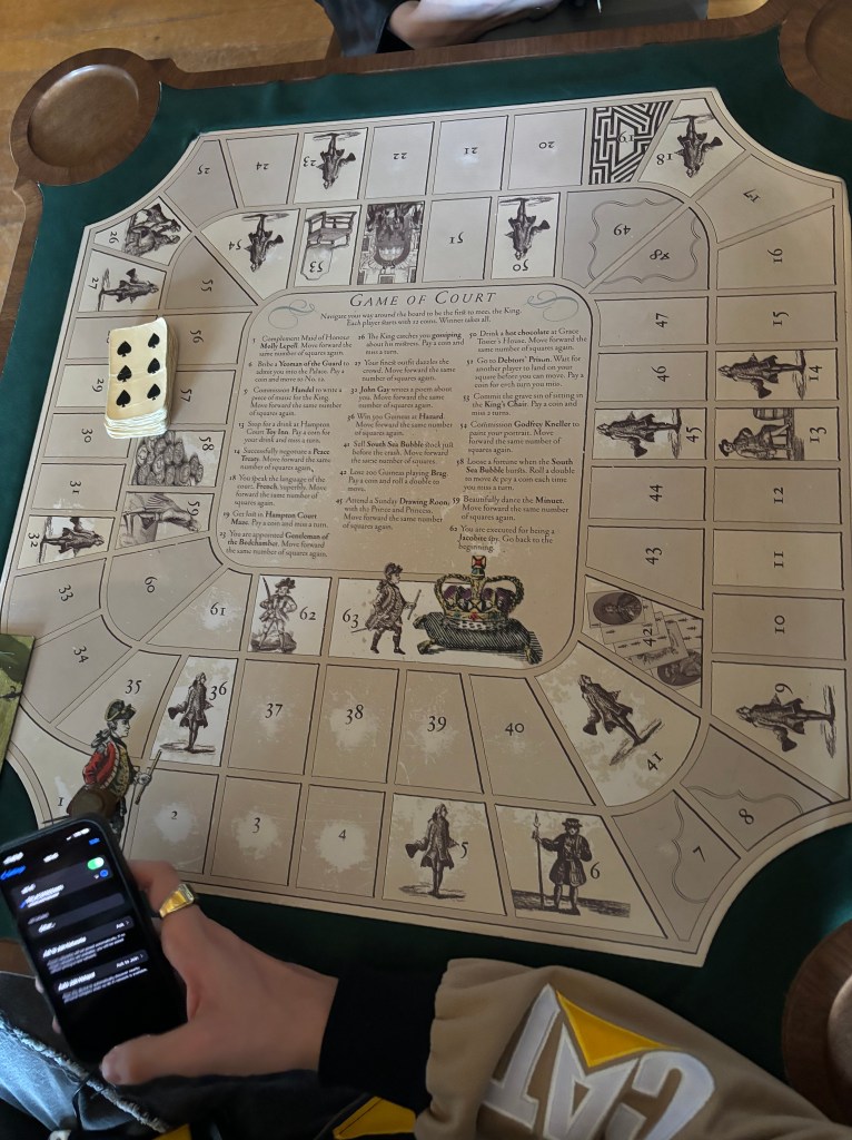 The actual palace kept this exhibition design, however walking through it felt more like a beautifully built museum than a touristy recreation. The architecture’s ornate design and exquisite color palette and the designs of the garden and fountain areas around the interior of the palace were truly something to behold, and seemed befitting of a royal palace. The church in particular was an awe-inspiring sight to behold, with its intricate ceiling showing the stars in the night sky and the overall sense of grandeur within the room giving it this air of divinity that made me scared to make a sound for fear of committing an act of disrespect. Besides the architectural styles of the palace being something to behold, the structure also held a number of artworks and artifacts belonging to the royal collections of Henry VIII as well as William and Mary. The palace held writings of and about Henry VIII’s wives, large pieces of religious artwork, two out of the nine pieces of Caesar’s Triumph (the first six of which are at the National Gallery, and the last one I have no idea where it is because I have not seen it), intricately folded dinner towels, examples of clothing styles that would have been worn around the palace, and even some tables in the Drawing Room dedicated to different (kind of terrible seeming) board and card games.