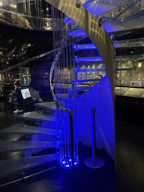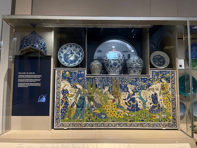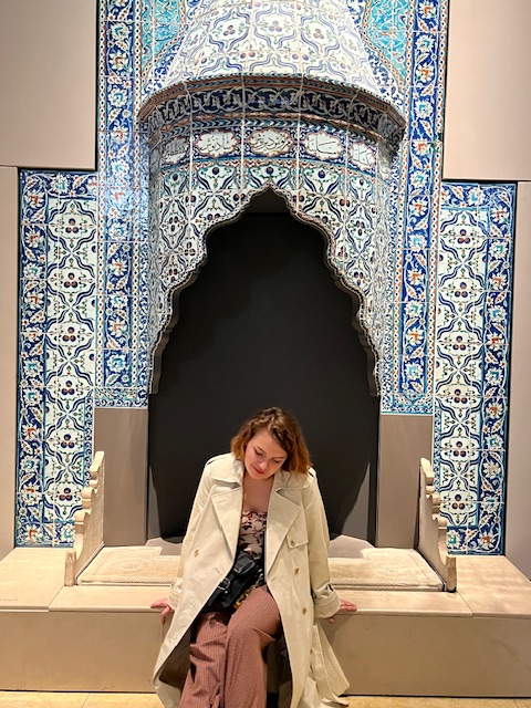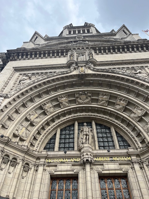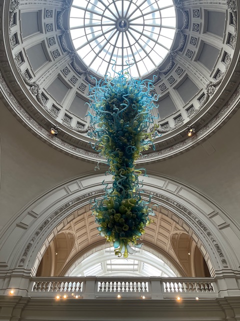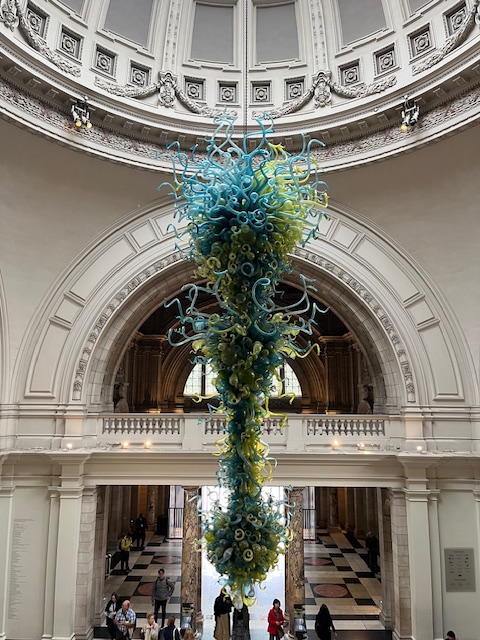 I thought about what I wanted to write about in this blog post, and in attempting to relate my experience to theatre I went on a scavenger hunt at the Victoria and Albert Museum. I did what the character from Bluets did in several scenes when strolling the museum. Walking through museums and art galleries, I searched for blue. I found a piece that was infiltrated by a few shades of green. Hanging in the main entrance was a phallic glass art piece suspended over the front desk, befitting the Bluets as the show was about sexuality and intimacy in the midst of heartbreak. Chaotic, engaging, and twisted, this piece of art made me recollect all of these themes and actions of the experience. It was extremely modern and full of life, just like Bluets. I think hanging a work of art like that at the entrance of the museum sets the tone of the space. A mix of art and history, modern and old, artifact and revolutionary. It is a distinguishing of the museum and the sign of a well-curated place.