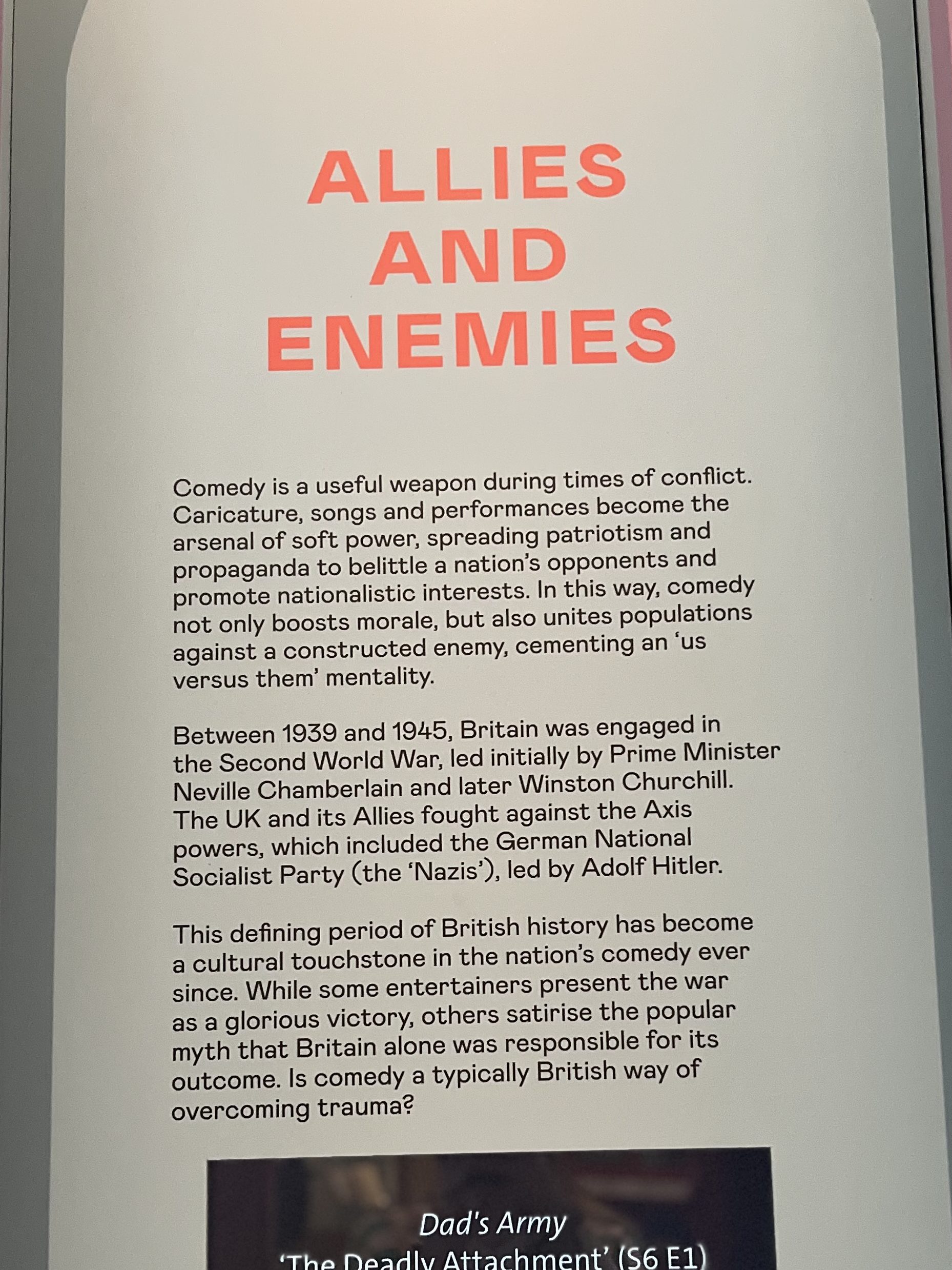 The specific artifact I want to discuss is a 1930s hand puppet that was on display. The puppet (photo below) was used to depict multiple tyrannical political figures of the day. This included people such as Hitler, Stalin, and Mussolini. According the the V&A website, this puppet reduced those figures to comedy characters and was used to ridicule them. There was a sign in the Clore room that discussed how comedy can be used to boost moral and unite people against an enemy, and one could see how these puppet shows may have done just that. In addition, the sign discusses how WWII, specifically, has been a major part of Britain’s comedy since it began. This made me think of Operation Mincemeat and how it uses comedy to tell a not-so-funny story from WWII. The show uses comedy to its advantage to make emotional moments more impactful, and the comedy also highlights the flaws and moral shortcomings of the people who took part in the operation. The comedy surrounding how the nazis in the show are presented is perhaps the best example of using comedy to demean terrible, political figures and make them face ridicule. Overall, Operation Mincemeat is an excellent example of how comedy can be used to face serious issues and stories and to cope with trauma.
