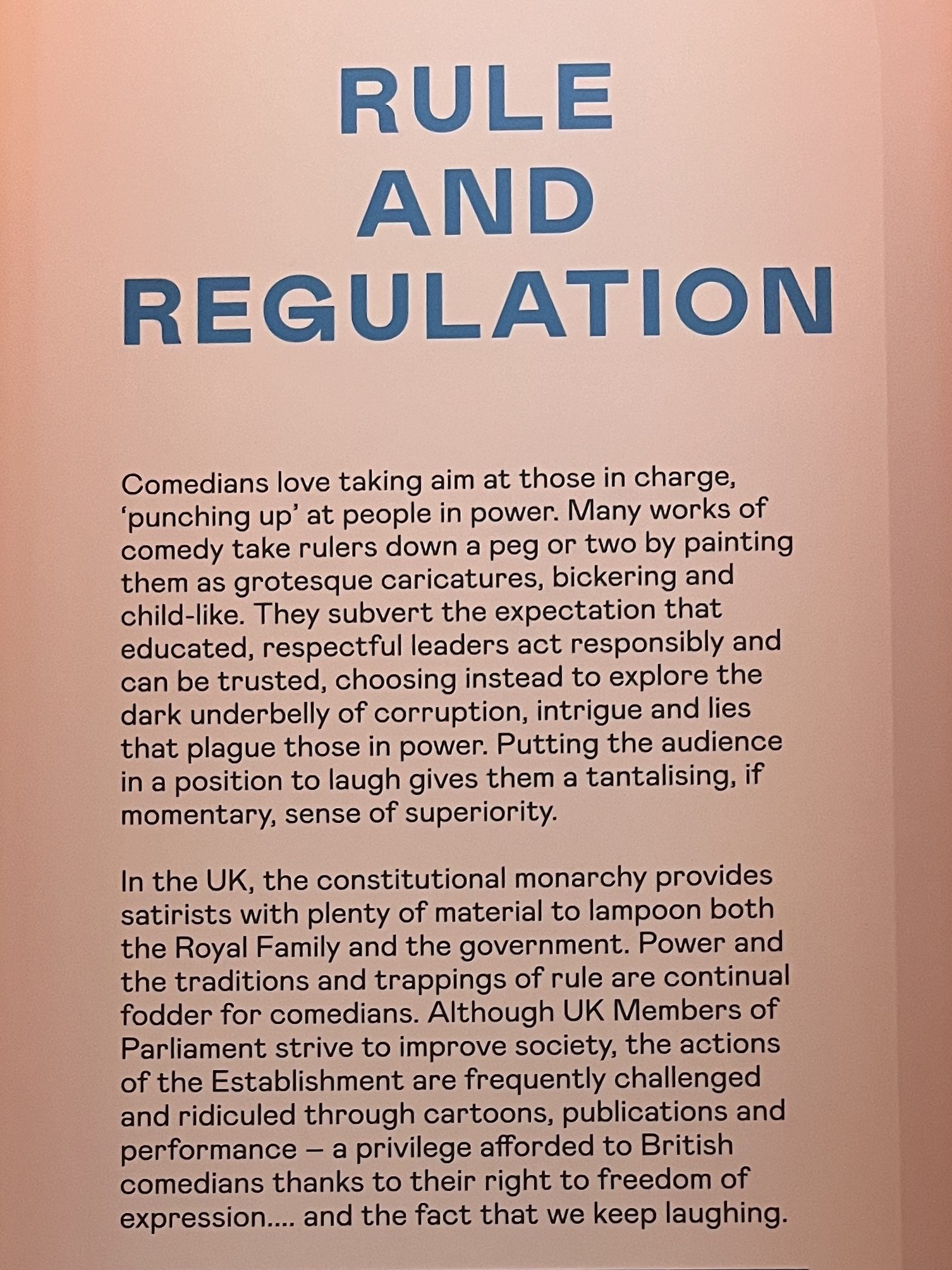 There was so much to explore here that I did not even get to see the whole museum before leaving. However, I was still able to see so much incredible art and history. Unfortunately, the theatre exhibit was closed. I will admit that I was very saddened by this revelation, but thankfully, theatre is all around us, and many random artifacts and exhibits I saw reminded me of shows we’ve seen and ignited my theatre brain. The British Galleries contained a lot of historical pieces that reminded me of Shakespeare, and I could see many of those artifacts being used in his plays as set pieces, costumes, etcetera. However, the exhibit that I feel connected to theatre and a show we’ve seen the most was the Clore Study Area room in the British Galleries that discussed how comedy has been used as a political and satirical tool for ages. The room contained multiple objects and had different historical comedy videos playing that demonstrated how comedy was (and still is) used during times of conflict.