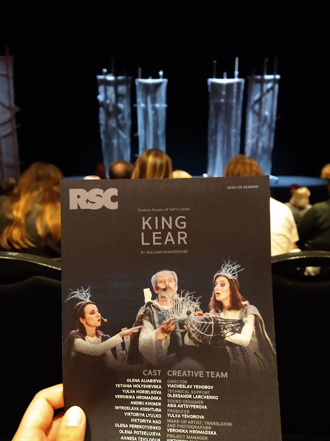 Last night, we saw King Lear which is currently running at the Royal Shakespeare Company’s The Other Place theatre. The twist: the entire thing was put on in somewhere over 90 minutes, in Ukrainian, without surtitling. The most context for the story that the average theatregoer has is the description of the story on the back of the free program, which is skillfully pared down from the original script. Considering that nobody on the trip speaks a lick of Ukrainian, this show was a trip. It’s pretty startling when the only words you can understand in a play are the words “yes,” “crown,” and your legal name.