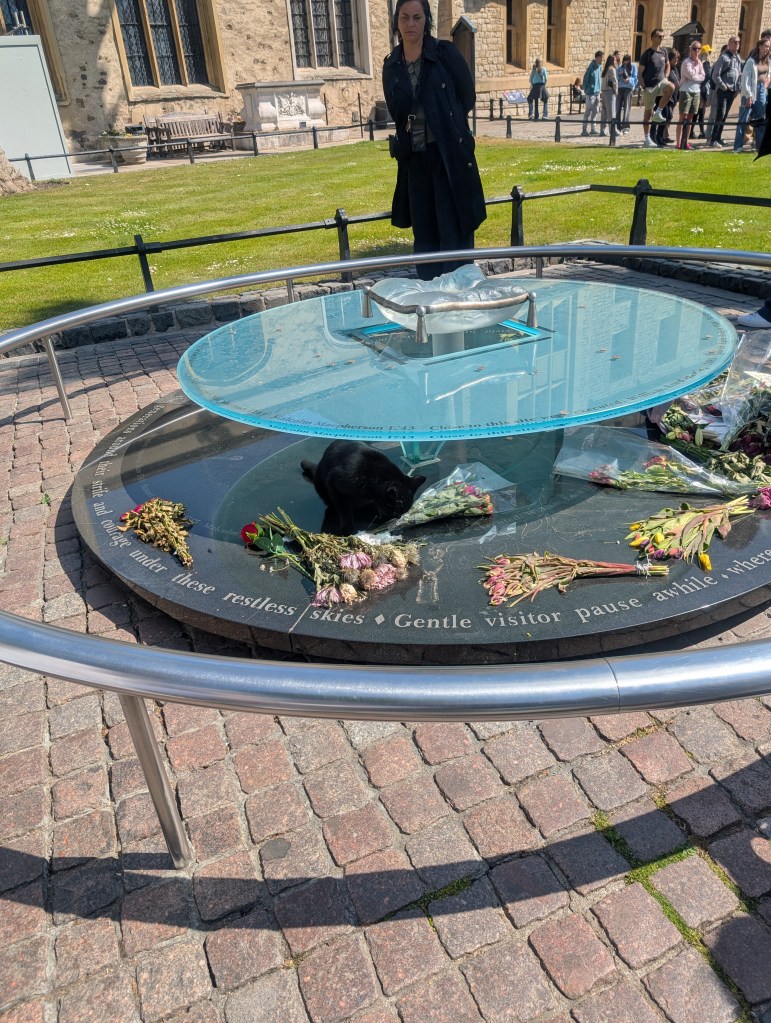 There was quite a large crowd there in fact, although they did not seem like they were there for Anne Boleyn, but rather the black cat that was sunbathing underneath the glass of her memorial. I looked it up and her name is Nyxie, and she moved in just last year. She belongs to one of the Yeoman Warders, the ceremonial guards of the Tower of London. She immediately stole my heart with how cute she was, and I could have spent the whole time watching her roll around in the sun if the rest of my group didn’t persuade me to move on.
