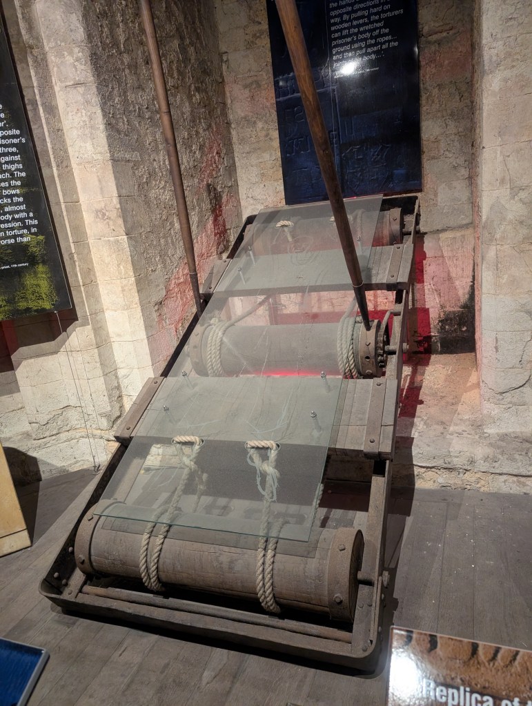 Next, we visited the Bloody Tower to learn about the fitting subject of torture. They said that (physical) torture was quite rare in England back in the day, and wasn’t officially part of any laws, however, over a period of time, over half of all recorded cases of torture occurred at the Tower of London. We saw a variety of instruments of pain, including shackles, “The Rack” which was designed to stretch out a man as far as possible, and the “Scavenger’s Daughter” which was designed to do the opposite, compressing someone as tightly as they could be without killing them, as well as details accounts of how they were used to hurt prisoners, with accompanying visuals. I found it morbidly interesting just how creative humanity can be when coming up with ways to inflict as much pain as possible on each other.