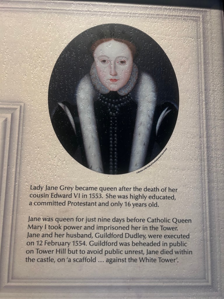 During my tour of the Tower of London, there was one historical person that I found the most compelling: Lady Jane Grey. Lady Jane Grey is one of my favorite historical figures. According to Historic Royal Places, Lady Jane Grey was born in 1537 to Lady Frances and Henry Grey, 3rd Marquess of Dorset. She became a favored successor to the throne during the rule of her cousin Edward VI. This was controversial because it came as a result of the disinheritance of his sisters, Mary and Elizabeth, so that the throne would pass to a male Protestant. So, after the death of Edward VI, she was crowned queen. Her reign was cut short. Her cousin Mary overthrew Lady Jane, had her and her husband imprisoned, and she was eventually put to death at the tower. Lady Jane died at just 17 years old. To this day, her reign remains the shortest in British history.