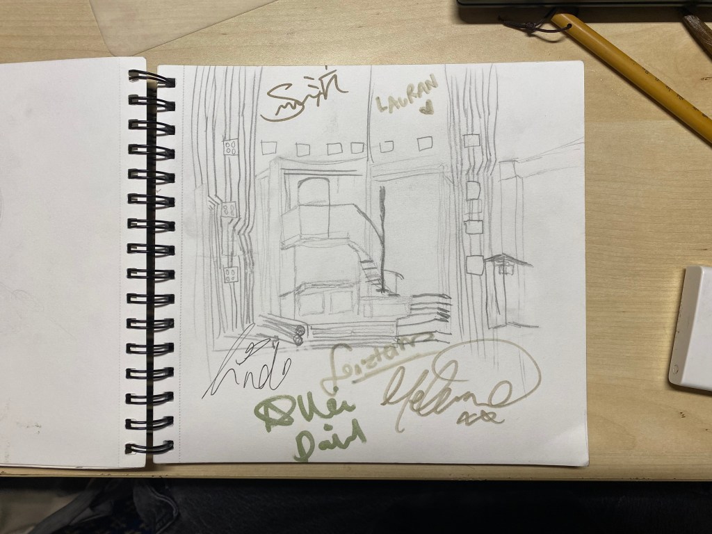 Intermission arrived, and I was struck with an idea. I would draw the set during this time, both as practice and as a keepsake. It was challenging, but I think I captured the vibe of the set without getting too stuck in the muck about details.