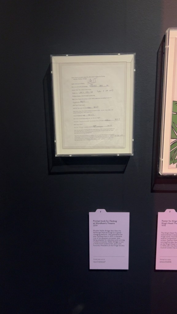As for the theater exhibit, I had a blast. There was one particular piece that stood out to me, which was a page of script from the show Fleabag. It had the writing of Phoebe Waller-Bridge (who wrote and acted in the play) and her notes on the scene. It was interesting to see, as I have never seen the stage play but have seen the television show based on it. I snapped a picture because it is one of my favorite television shows ever, and I wanted to go back and watch the proshot of the play later.
