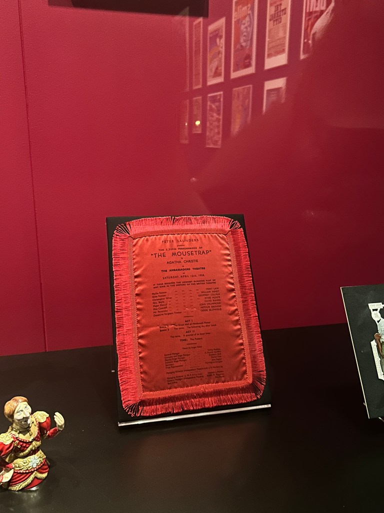 Among the displays, a crimson-colored, shiny rectangle became visible to me. A closer look showed me that it was actually a playbill from the 2239th run of Agatha Christie’s The Mousetrap. Specifically it commemorated the show’s five and a half year running point on 12 April 1958. An incredible accomplishment, one that now looks meager in comparison to the 72 years it has been performed as of this year. Additionally, the show also holds the record for the most performances still to this day. This playbill is a beautiful testament to the life and vibrancy of good theatre. It is no secret that the arts are not being valued as they once were; however, The Mousetrap shows that theatre is not a dead industry.