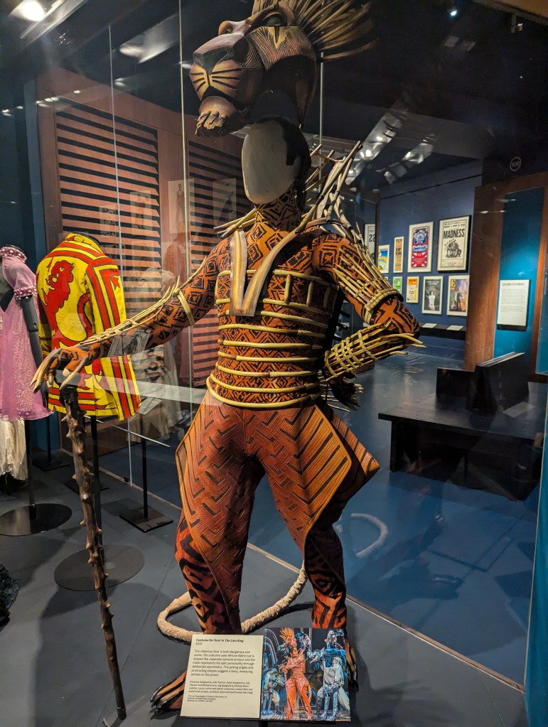 While I am not usually a fan of classical art museums, the Victoria and albert museum had some very interesting displays, my favorite of which unsurprisingly being the theatre and film exhibit. The first thing that really caught my eye was the miniature sets on display, showcasing the scenery in a way that would be hard to do with just a photograph. I was also really captured by some of the costumes that were on display, especially the costume for scar from the lion king play. I have always had a fascination with puppetry and find it really interesting how the play merged elements of puppetry into the costumes to create more animalistic and animated appearances. Being up close to the costume also made me realize the intricacy of the patterning of the fabric used for the costume. It has a gradient throughout with checkered-esque pattern that further sells the illusion of a lion’s coat