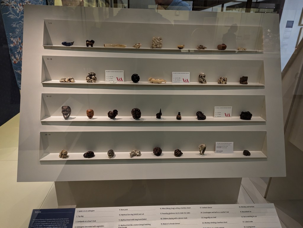 Outside of the theatre and film exhibit I really enjoyed walking through the Japan exhibit. While somewhat small compared to the others in the museum, it had some really interesting pieces. I really enjoyed looking at the netsuke, which are little statues that used to be used to keep cords tied on kimonos. They had quite a large collection of these, and they all depicted different things. I was surprised at the diversity in styling, material, and subject matter among these relatively small statues.