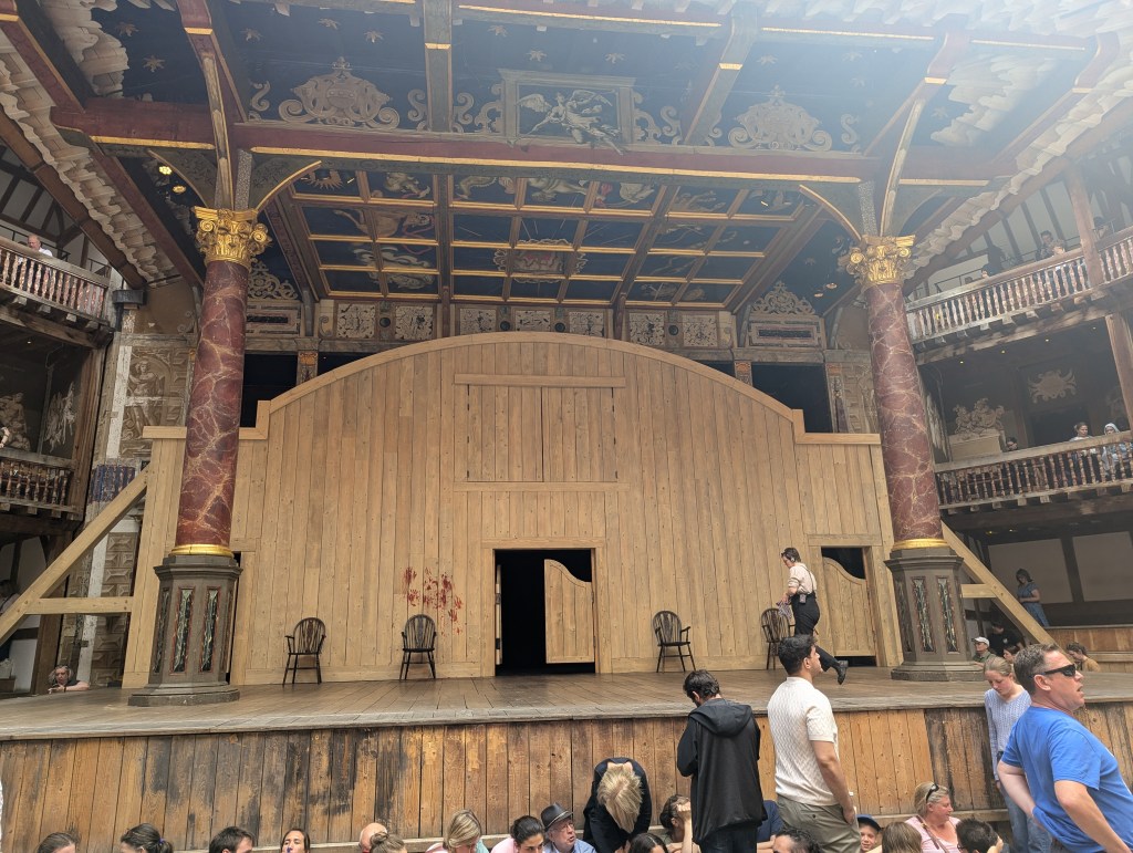 Shakespeare’s globe theatre is by far the unique theatre watching experience I have ever had. Even when first walking in I was surprised by the theatre’s structure. While I had been told that it was a full circle, I don’t think I really understood how that would look as a theatre until I got in there. I also did not anticipate how the standing room would work. In my head it was still a very organized system where people had general spots they could stand, but it was much more like a concert where everyone just squeezed in around the stage. The way that the actors utilized this space and its unique properties was also very interesting. While I knew about Shakespeare’s direct addresses to the audience, I did not anticipate the level of audience participation that was present. My favorite moment of this was when Romeo was trying to hide so he took off his hat, slid off the stage, and blended in with the crowd of spectators surrounding the stage.