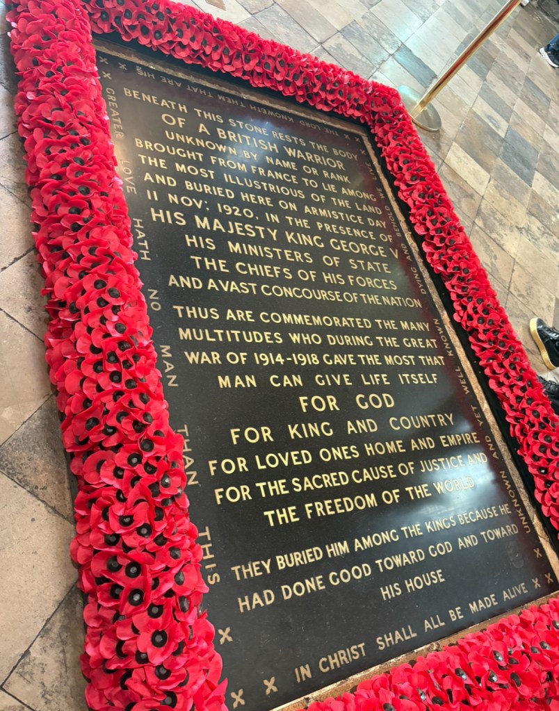 Westminster Abbey was by far probably one of the most interesting places we’ve been on this trip so far. Anything that old is bound to be interesting, and most everything in London is around that old, give or take. When we first got there we got to learn a lot about the Abbey while surrounded by graves from as early as the 1100’s. We made our way through current living quarters, till we entered the nave itself. Here we got to see the coronation chair and, right by the door way, the Tomb of the Unknown Warrior. This is their version of the Tomb of the Unknown Soldier (which you probably could’ve gathered), and if you know anything about me at all it shouldn’t surprise you that seeing this part made me cry a good deal.