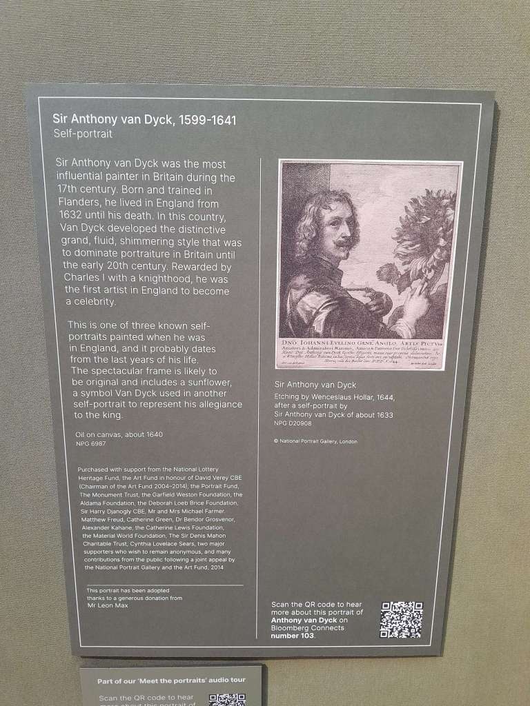At the National Portrait Gallery, I consistently found myself drawn to self portraits. It was entirely unintentional as well; one would catch my eye and I would wander over to inspect it, only to discover it to be a self-portrait. In fact, most of the options I ended up giving myself for the subject of this assignment were self-portraits. I can’t for the life of me articulate why, either. I did end up choosing a self-portrait, specifically one done by Sir Anthony van Dyck: