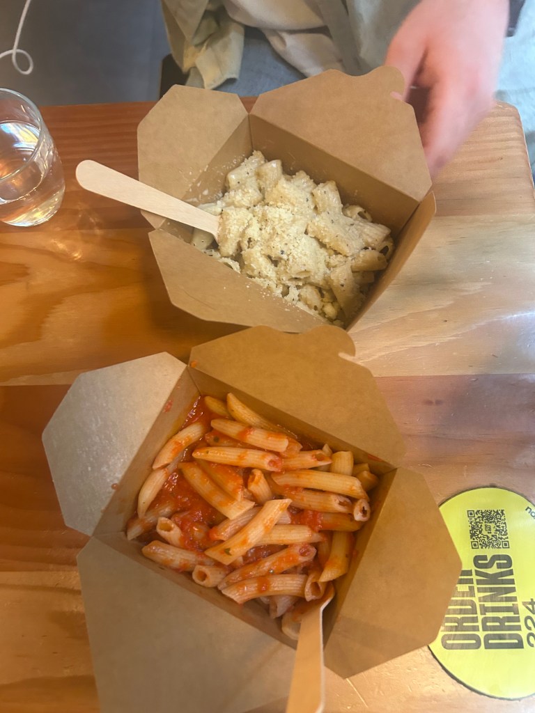 One of the first meals we had while we were here was at Seven Dials market before we saw Mousetrap. I chose a delicious-looking pasta place and had a basic tomato sauce with pasta. There was a little set-up behind the counter where the cook put together our food right in front of us. For my meal, I saw her scoop up pasta and warm it through, and then I saw her ladle some tomato sauce into it. While I think the 8-pound price tag for boxed pasta and tomato sauce was a bit high, it was absolutely amazing. It was quite a small serving, and due to the pasta being precooked, it was a bit soggy when I ate it, but the flavor of the tomato sauce made up for it.