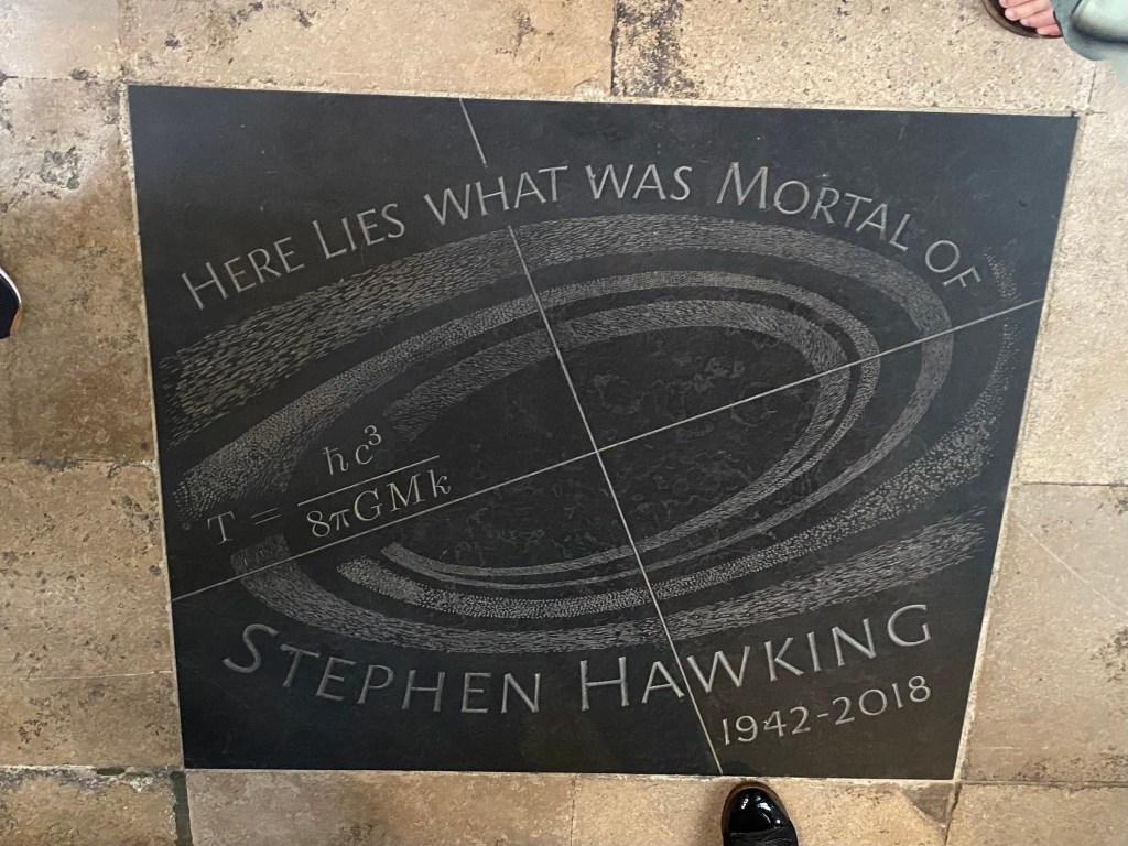 If time is cruel, space is tricky. Where time is mostly a matter of perception for humans, space is a little more insolvent than that. To grapple with physical science for one’s whole life sounds to me like trying to count infinity: a Sisyphian task. Stephen Hawking was interred at Westminster Abbey not far from Thomas Tompion. His modern headstone is a lot cooler in my opinion. It shows a portion of his equation describing the radiation black holes emit, called Hawking radiation after the man himself. He committed much of his life to this work, and in death is remembered.