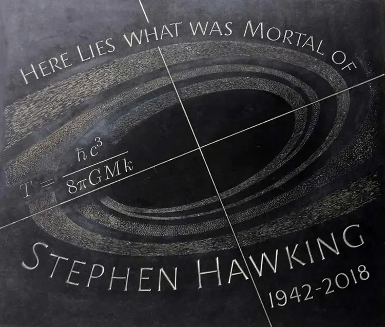 Between the graves of celebrated scientists, Charles Darwin and Isaac Newton, the ashes of Stephen Hawking were buried to honor him as one of Britain’s greatest scientists. The grave stone’s inscription is an English translation of a phrase which appears in Latin on Newton’s gravestone: Here lies what was mortal of Stephen Hawking. I found that this phrase serves as a lovely testament to his life work and is meant to represent the notion of his soul being other worldly. His grave stone depicts an engraved image of a series of rings, surrounding a darker central ellipse. The ten characters of Hawking’s equation express his idea that black holes in the universe are not entirely black but emit a glow, that would become known as Hawking radiation.