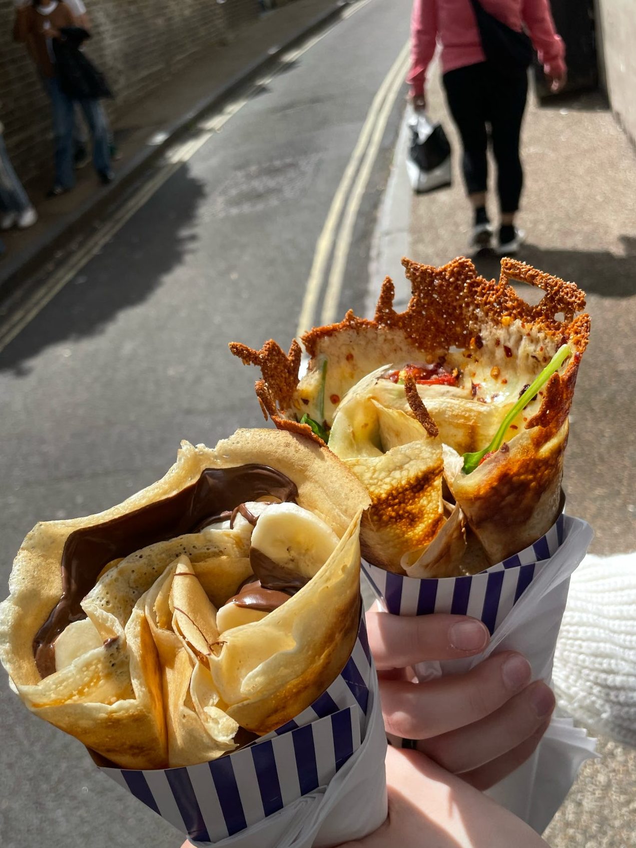 My friend, Katerina from the Czech Republic visited me during our long weekend with no planned itinerary. We decided to take a day trip to Hampstead where we tried these two different types of crepes at the famous stand, ‘La Crêperie.’ We ordered a crepe with tomato, pesto and mozzarella and then the other crepe with bananas and Nutella. The warm, thin flour tortillas were perfect for the high quality ingredients in each crepe. This meal tasted immensely tasty, was affordable, and perfect for holding while walking around town.