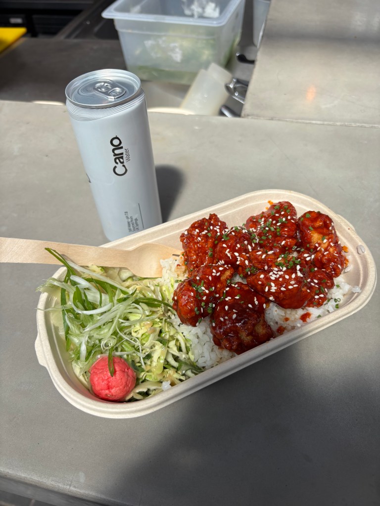This Korean dish consists of fried Yangnyeom chicken in a sweet, spicy and savory sauce. The name, Yangnyeom itself means ‘seasoned’ or ‘marinated’ in Korean. The Young Num bowl also contained a side of salad and sticky white rice along with some sesame seeds on-top. I had the dish with a canned water in Spitalfield market. It was one of the tastiest dishes I’ve ever tried. The crunch of the chicken accompanied with the blend of the sauces added the perfect contrast of textures.