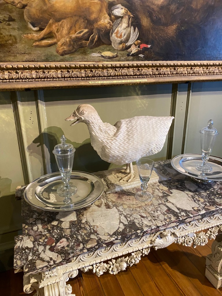 Next stop on the journey were the apartments and Tudor-era area. I didn’t absorb much of the history, to be honest. It’s not my area of expertise nor interest. I liked the way this area was displayed more than the kitchens. It felt more honest and cared for. I could visualize the dining experience here. I could hear the whispers of gossip and drama in the corners of sitting rooms and hallways. I especially enjoyed one room with seats and speakers simulating a room where lords would debate politics, in which myself, some friends, and a few other tourists pantomimed speaking the lines our chairs produced. The final point of interest here was a set of displays using origami techniques I recognized, the Herringbone Tesselation. The pattern was used all over multiple displays, but here I have one of a duck.